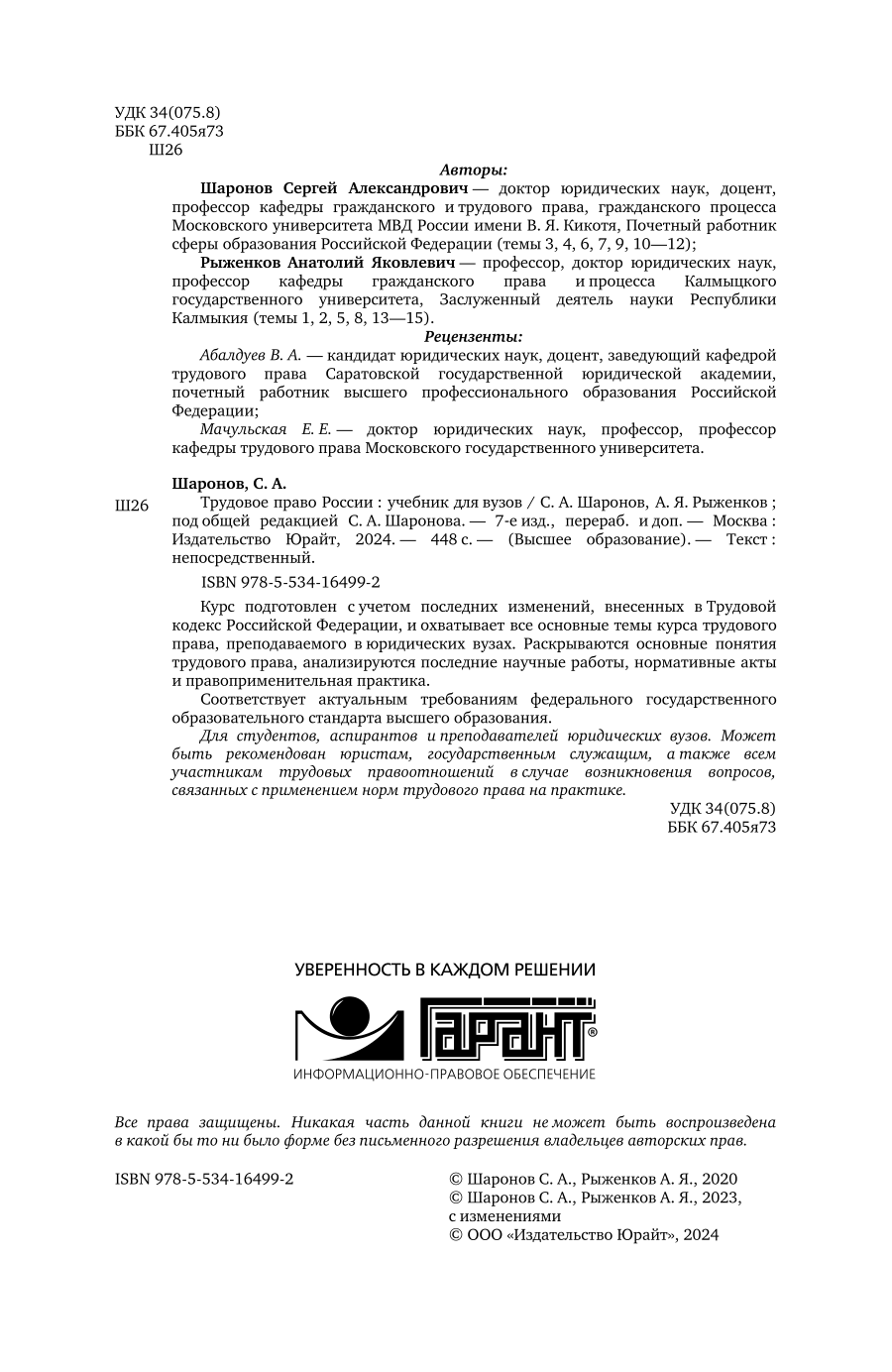 Трудовое право России 7-е изд. пер. и доп. Учебник для вузов (Шаронов Сергей Александрович), 2024