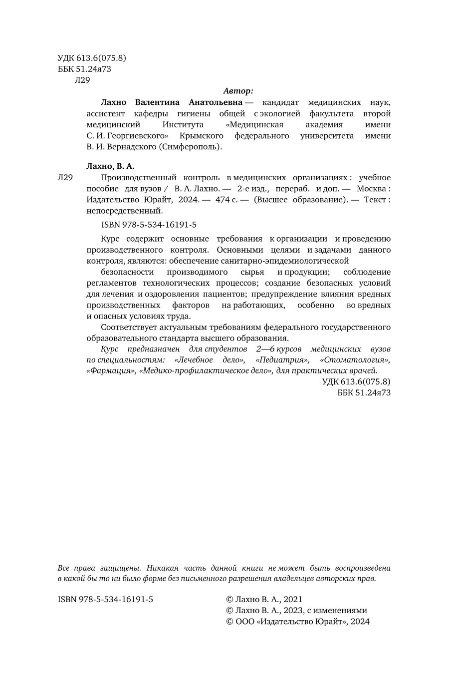 Производственный контроль в медицинских организациях 2-е изд. пер. и доп. Учебное пособие для вузов (Валентина Анатольевна Лахно); ЮРАЙТ, 2023