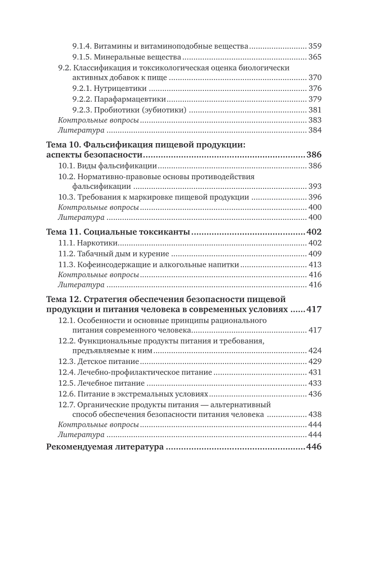 В курсе изложены национальные и международные аспекты безопасности пищевой продукции с учетом требований основных международных организаций, занимающихся вопросами регулирования контроля качества и безопасности пищевого сырья и продуктов питания. Курс затрагивает вопросы нормативно-законодательной основы безопасности пищевой продукции в Российской Федерации и Таможенном союзе. Показаны основные виды и пути загрязнения продуктов питания соединениями из внешней среды и токсинами природного происхождения. Приведены потенциальные риски применения генномодифицированных организмов и нанотехнологий в производстве продуктов питания. Особое внимание уделено опасностям обогащения пищевой продукции питательными веществами без учета основных критериев безопасности питания человека, а также стратегическим направлениям его обеспечения. Содержание курса соответствует актуальным требованиям федерального государственного образовательного стандарта среднего профессионального образования и профессиональным требованиям. Для студентов образовательных учреждений среднего профессионального образования, обучающихся по аграрным специальностям, преподавателей, аспирантов и специалистов, работающих в области пищевой технологии и химии, экологии и диетологии.