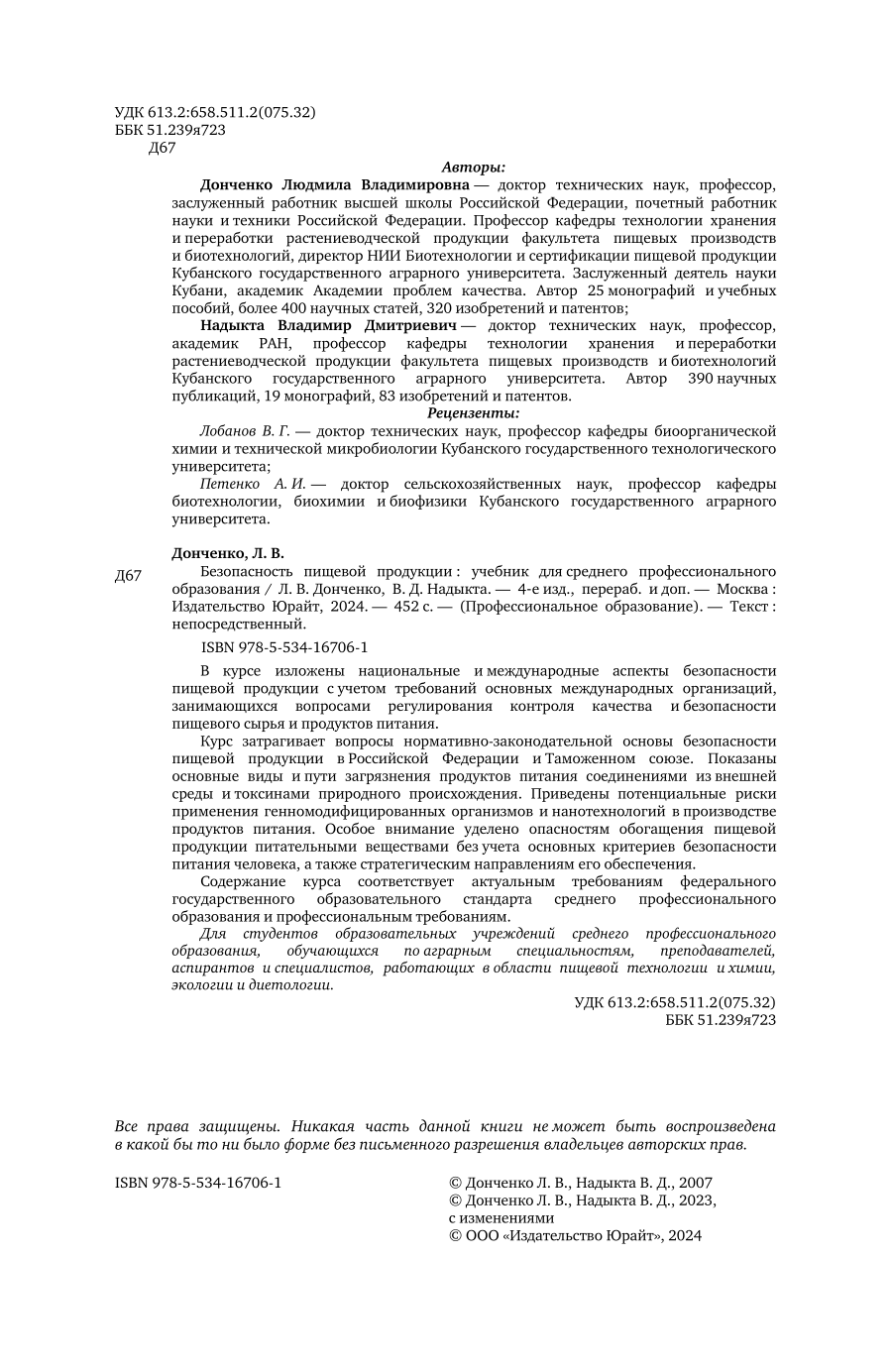 Безопасность пищевой продукции 4-е изд. пер. и доп. Учебник для СПО (Людмила Владимировна Донченко); ЮРАЙТ, 2023