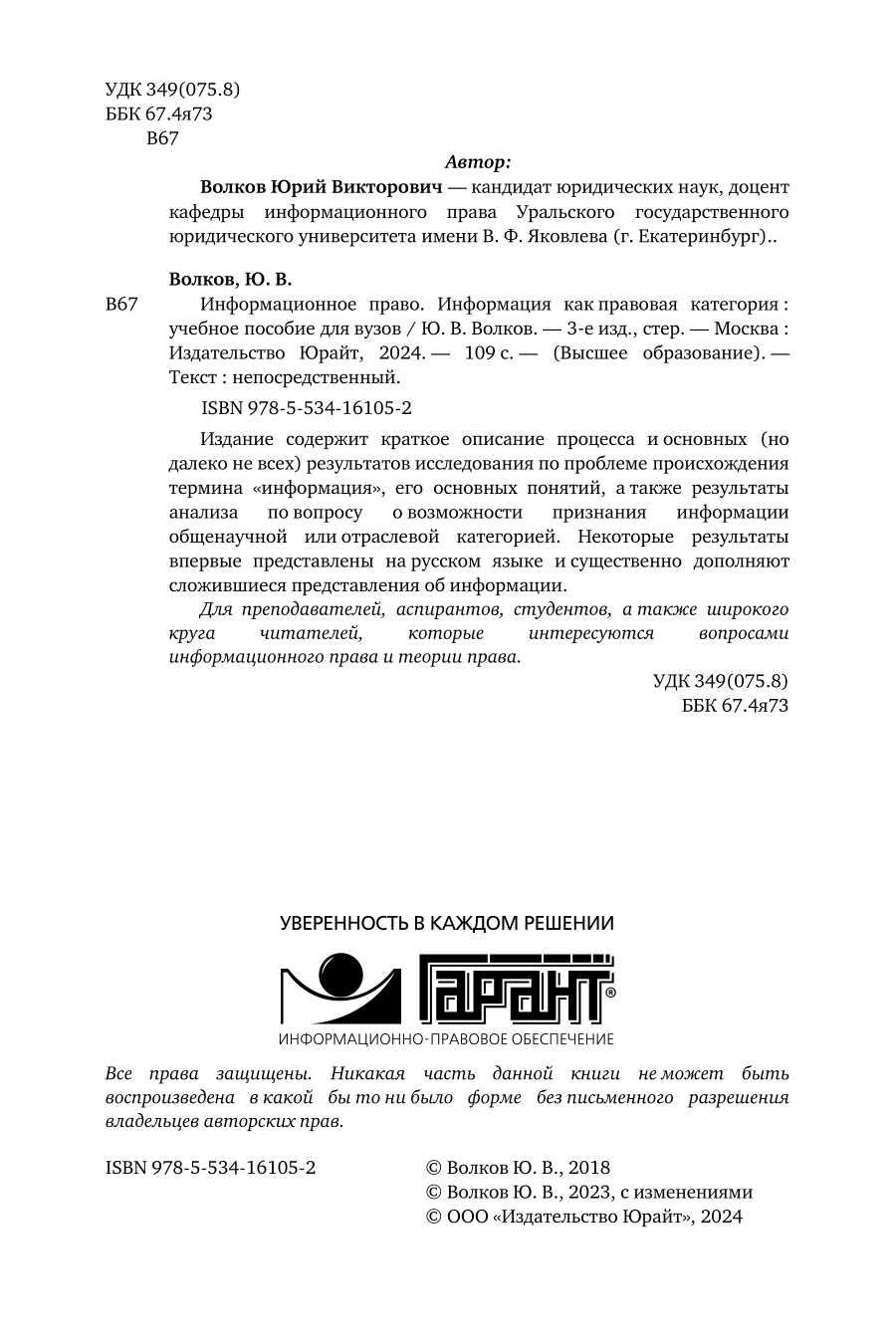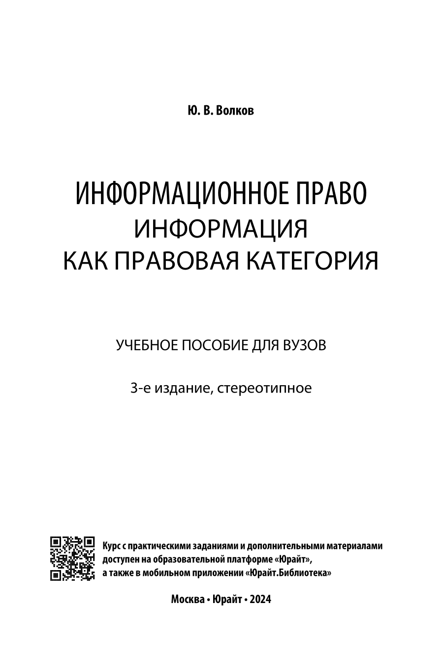 Информационное право. Информация как правовая категория 3-е изд. Учебное пособие для вузов (Юрий Викторович Волков); ЮРАЙТ, 2023
