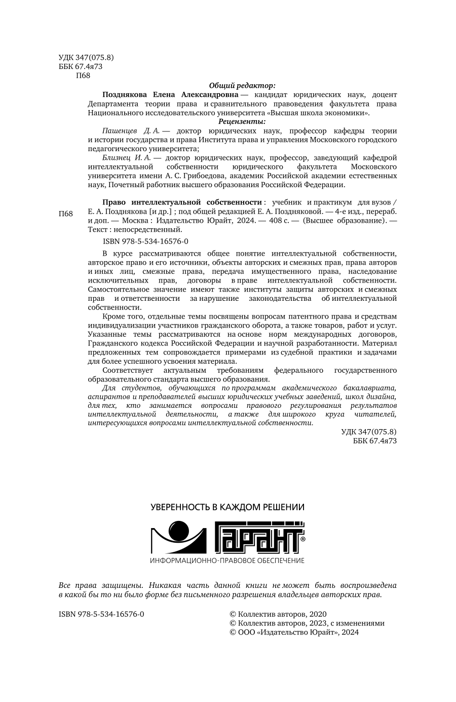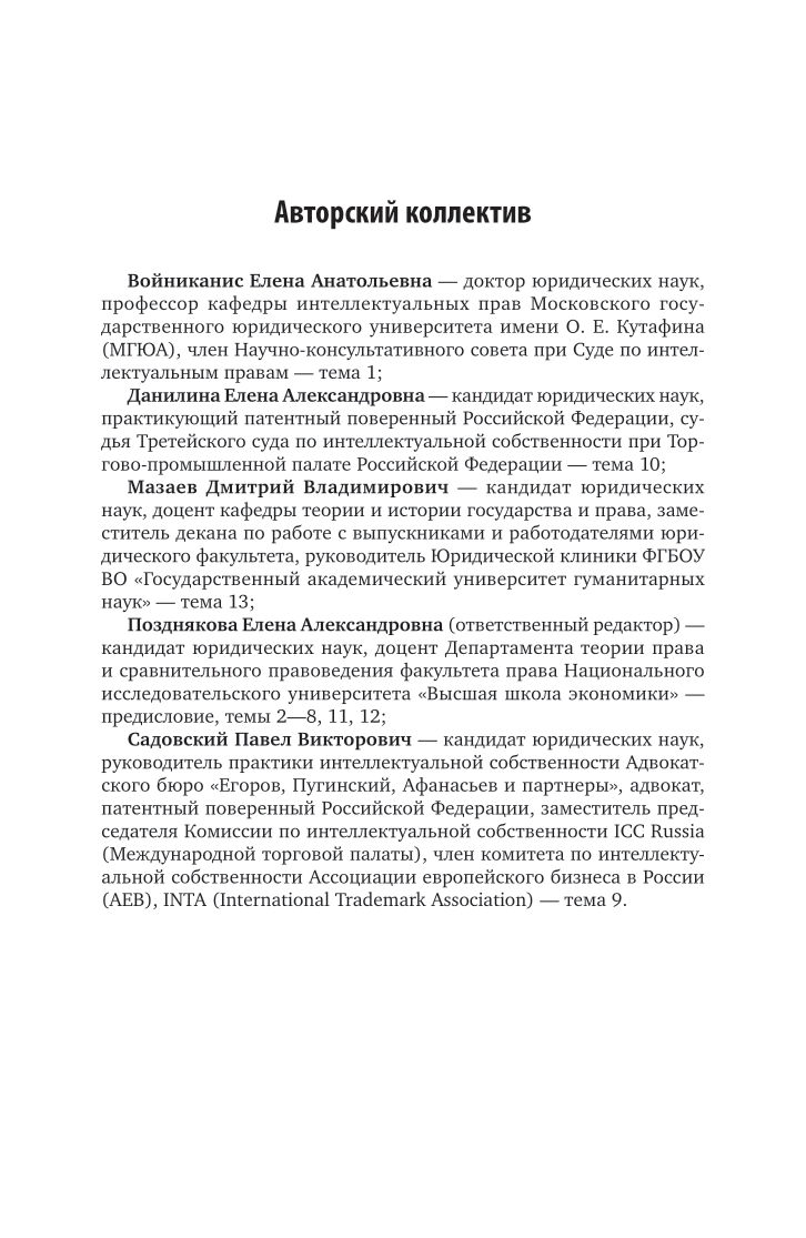 Право интеллектуальной собственности 4-е изд. пер. и доп. Учебник и практикум для вузов (Позднякова Елена Александровна, Войниканис Елена Анатольевна, Данилина Елена Александровна, Мазаев Дмитрий Владимирович, Садовский Павел Викторович), 2023