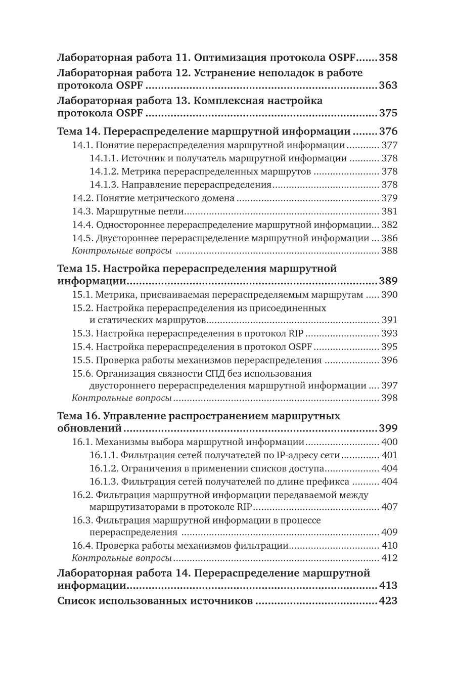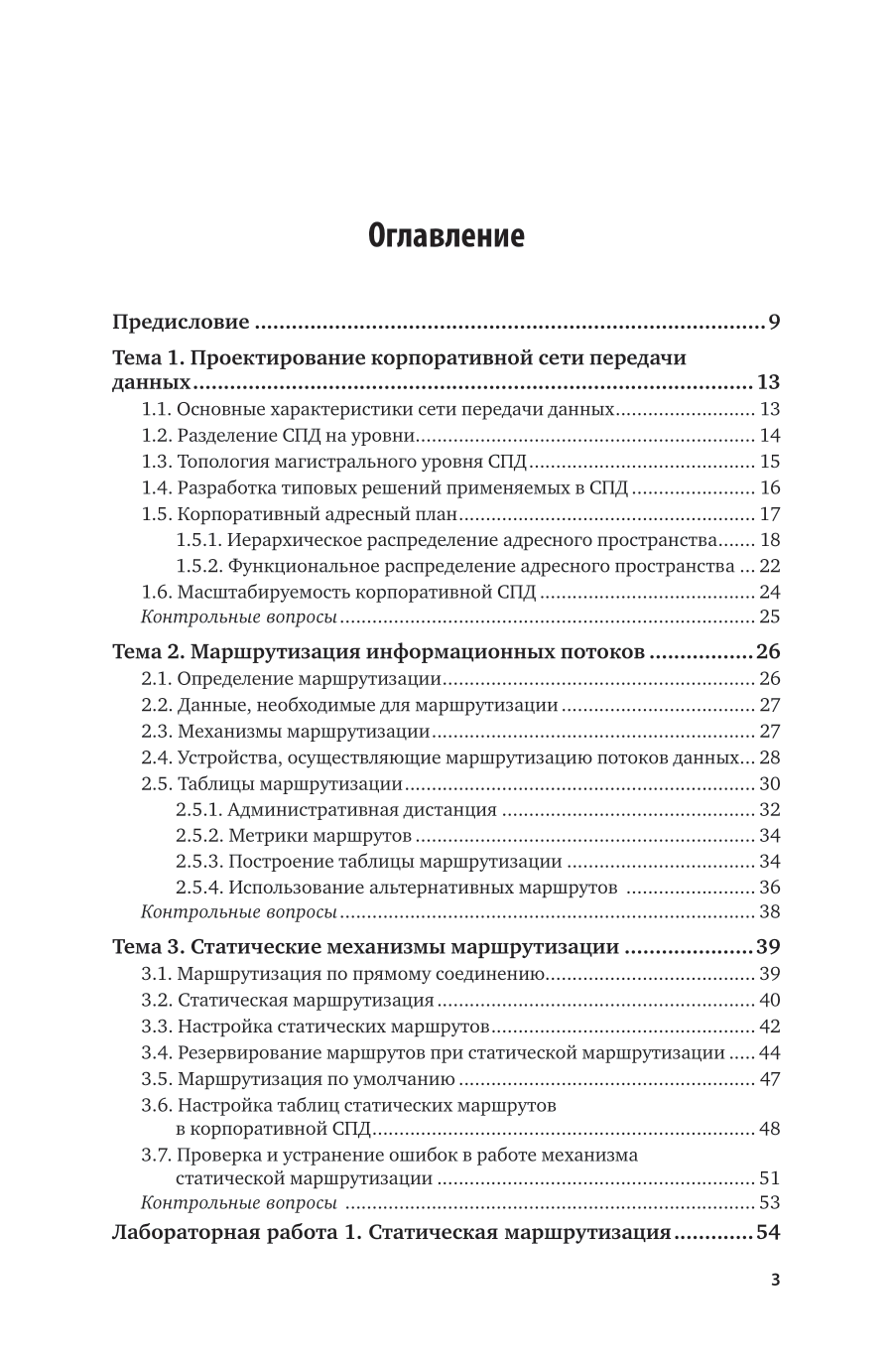 В учебнике рассматриваются различные модели архитектуры сетей передачи данных, различные протоколы маршрутизации, а также алгоритмы, используемые в этих протоколах. Подробно разбирается работа как дистанционно-векторных, так и протоколов маршрутизации по состоянию канала. Описывается реализация, использование и оптимизация работы протоколов RIP, EIGRP, OSPF, маршрутизация в одной или нескольких зонах, совместная работа нескольких протоколов маршрутизации, создание и использование виртуальных каналов, управление трафиком маршрутных обновлений, маршрутные карты и маршрутизация по политикам. Учебник включает большое количество лабораторных работ, покрывающих все содержание курса. Материалы к лабораторным работам расположены в Электронной библиотечной системе «Юрайт» ().