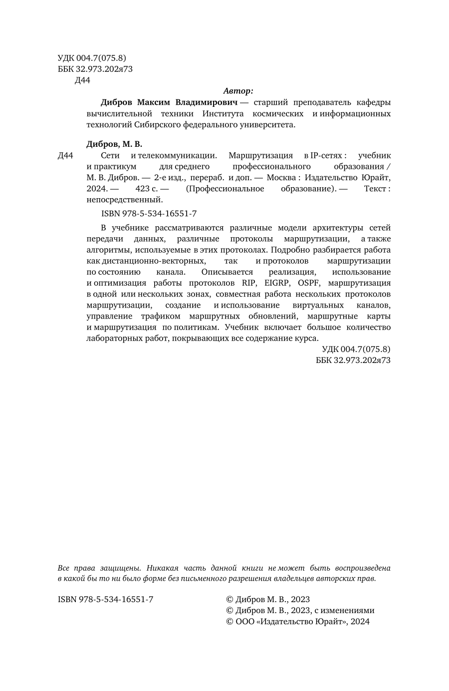 Сети и телекоммуникации. Маршрутизация в IP-сетях 2-е изд. пер. и доп. Учебник и практикум для СПО (Максим Владимирович Дибров); ЮРАЙТ, 2023