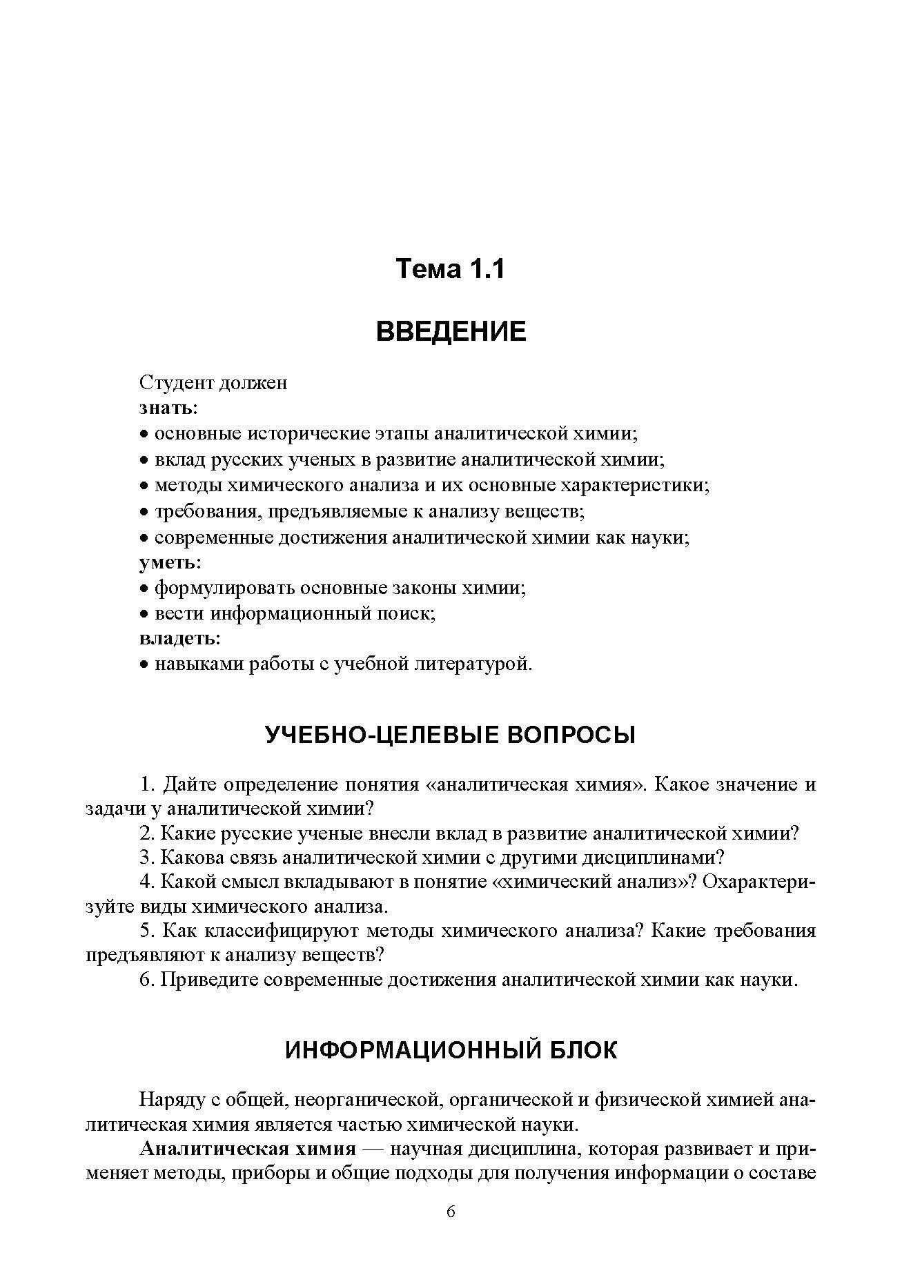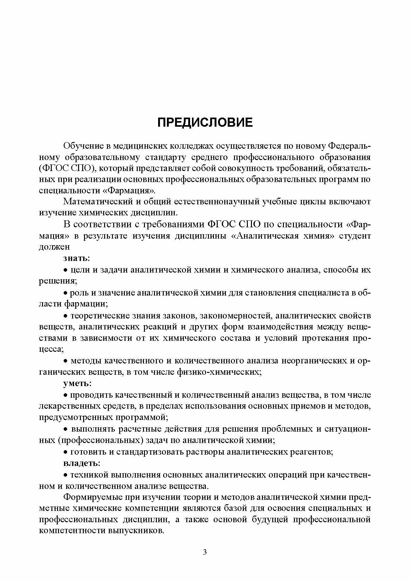Учебное пособие состоит из трех разделов: «Теоретические основы аналитической химии», «Качественный химический анализ», «Количественный анализ». Аналитическая химия является базовой учебной дисциплиной, необходимым фундаментом для изучения профильных предметов и формирования профессиональных компетенций будущих фармацевтов. Входит в состав комплекса учебно-методических пособий: «Общая и неорганическая химия»; «Аналитическая химия»; «Органическая химия». Учебные пособия объединены общей идеей, имеют общую структуру, нацелены на формирование как общекультурных, так и профессиональных компетенций будущего фармацевта. Для студентов медицинских колледжей, обучающихcя по специальности «Фармация».