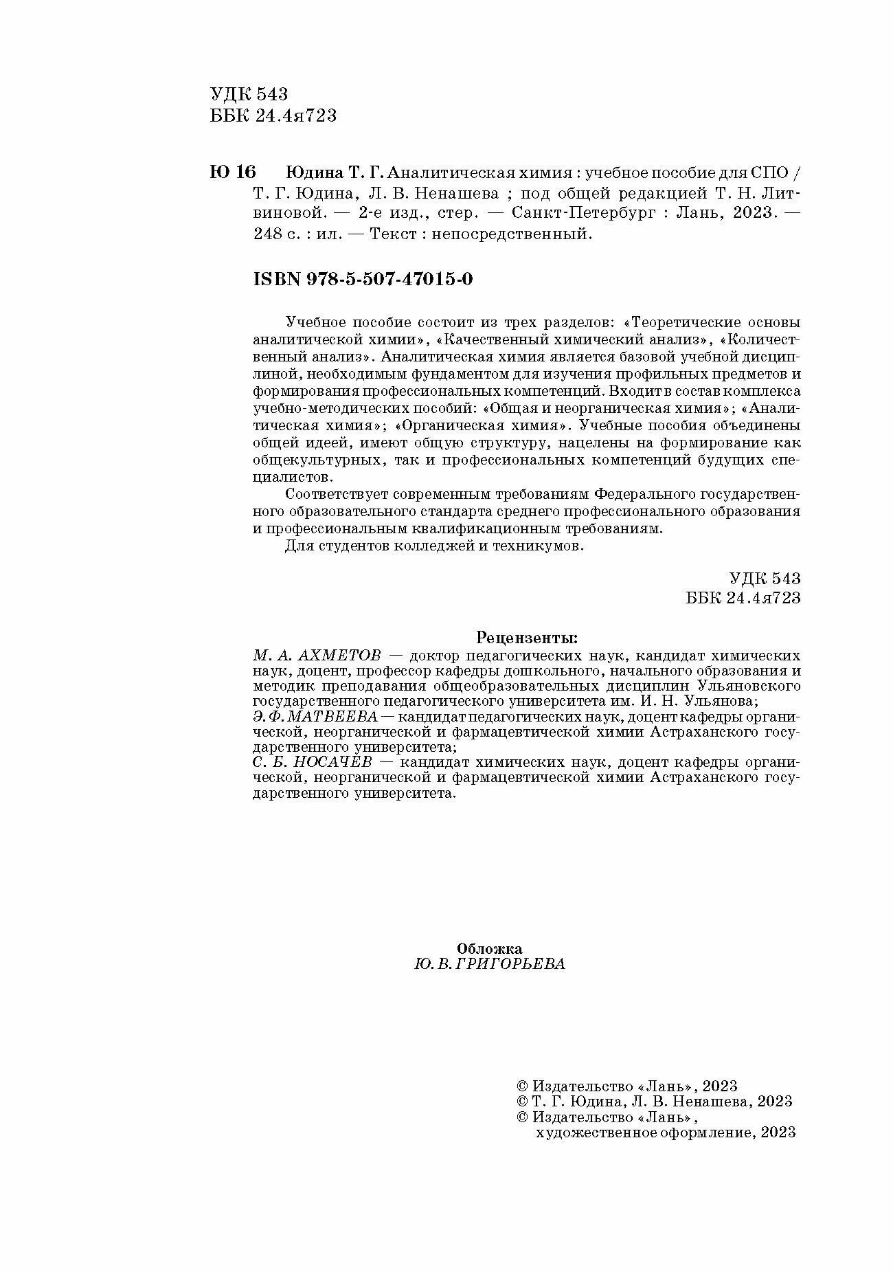 Аналитическая химия. Учебное пособие для СПО (Юдина Татьяна Геннадьевна, Ненашева Лариса Владимировна); Лань, 2022