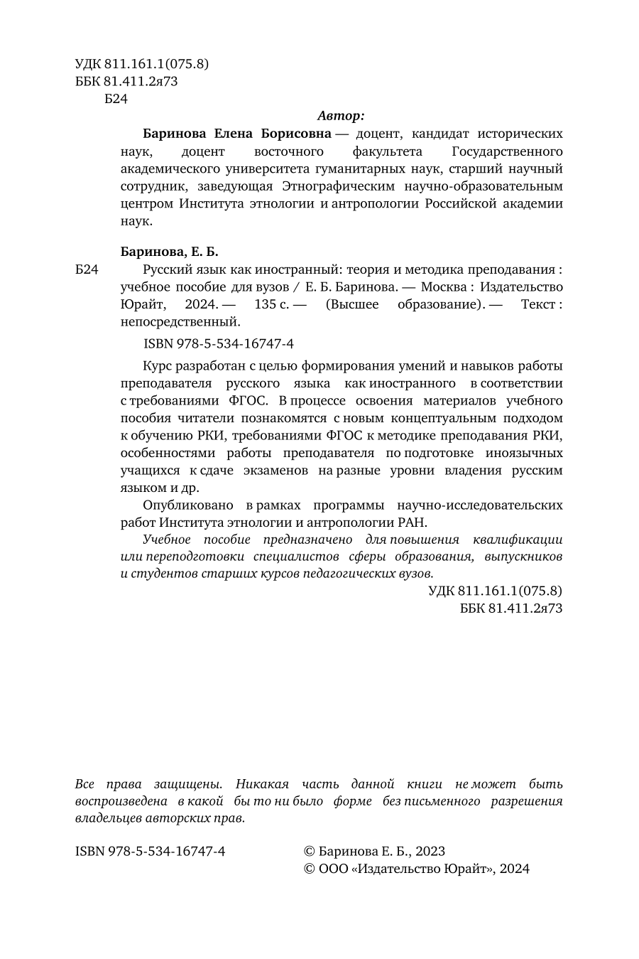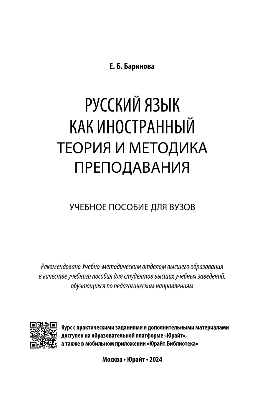 Русский язык как иностранный: теория и методика преподавания. Учебное пособие для вузов (Елена Борисовна Баринова); ЮРАЙТ, 2023