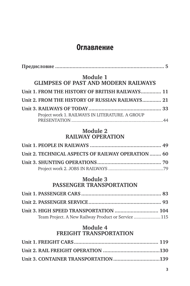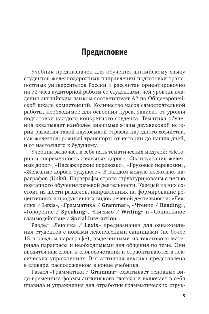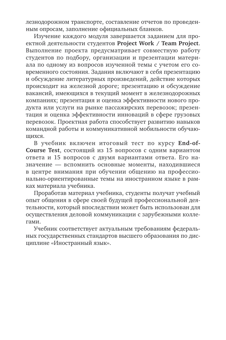Учебник предназначен для студентов-бакалавров железнодорожных направлений подготовки с уровнем владения английским языком не ниже А2. Основная цель учебника - формирование иноязычной профессиональной коммуникативной компетенции, включая развитие умений разных видов чтения, говорения, письма и социального взаимодействия на основе тем, связанных с будущей специальностью студентов. В учебник включены задания для проектной деятельности студентов и итоговый тест по курсу. Учебник предусматривает активную тренировку системы видо-временных форм английских глаголов и снабжен грамматическим справочником. Учебник также может быть использован всеми желающими расширить возможности своего общения на английском языке, включив в него темы, связанные с железнодорожным транспортом. Учебник соответствует актуальным требованиям федеральных государственных стандартов высшего образования по дисциплине «Иностранный язык».