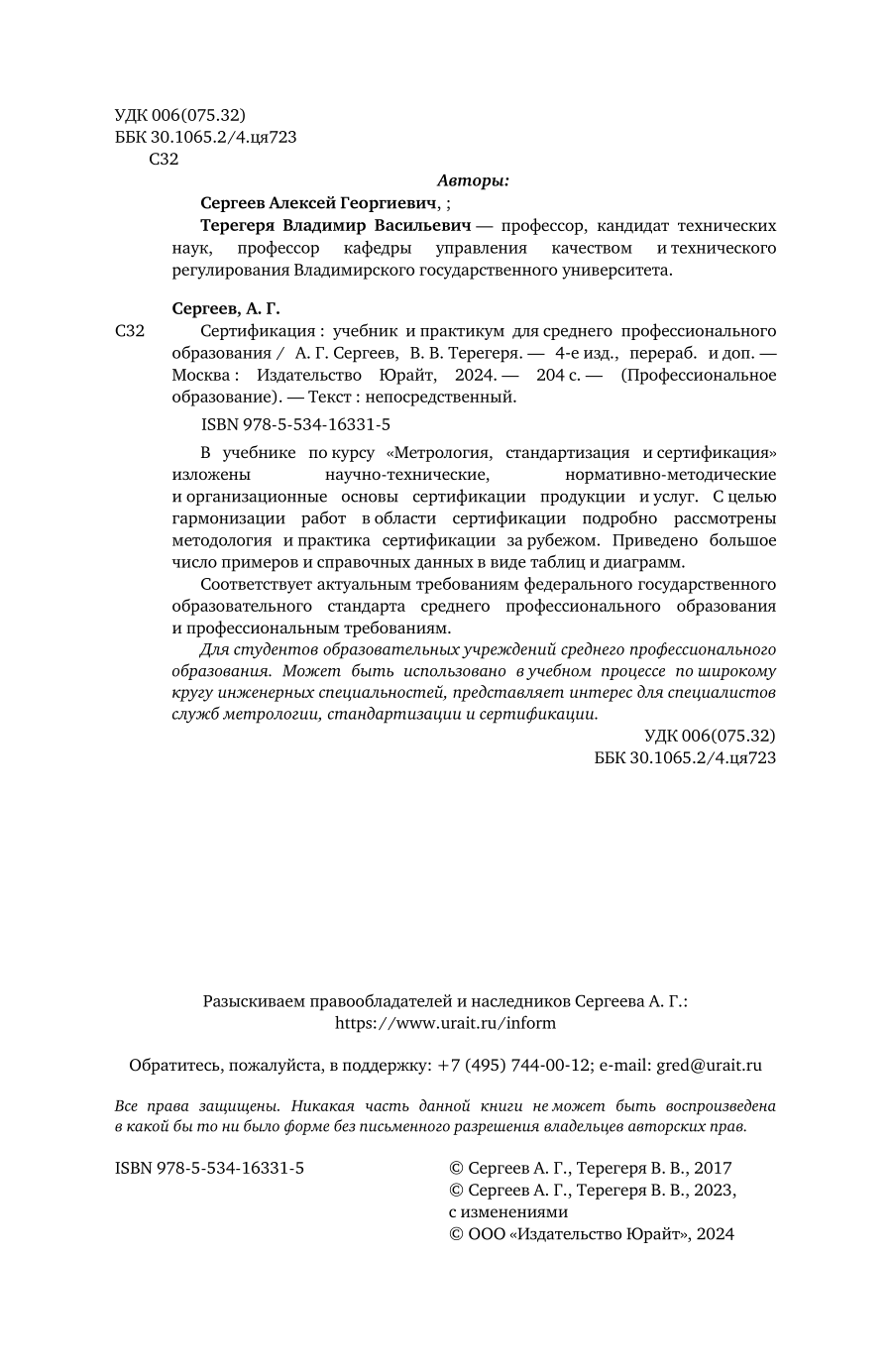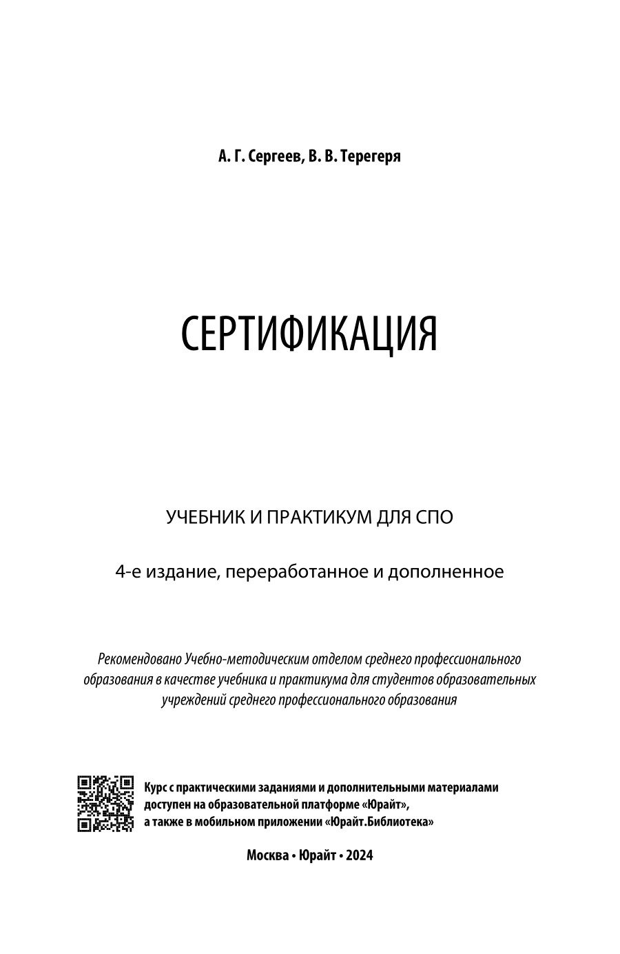 Сертификация 4-е изд. пер. и доп. Учебник и практикум для СПО (Алексей Георгиевич Сергеев); ЮРАЙТ, 2023