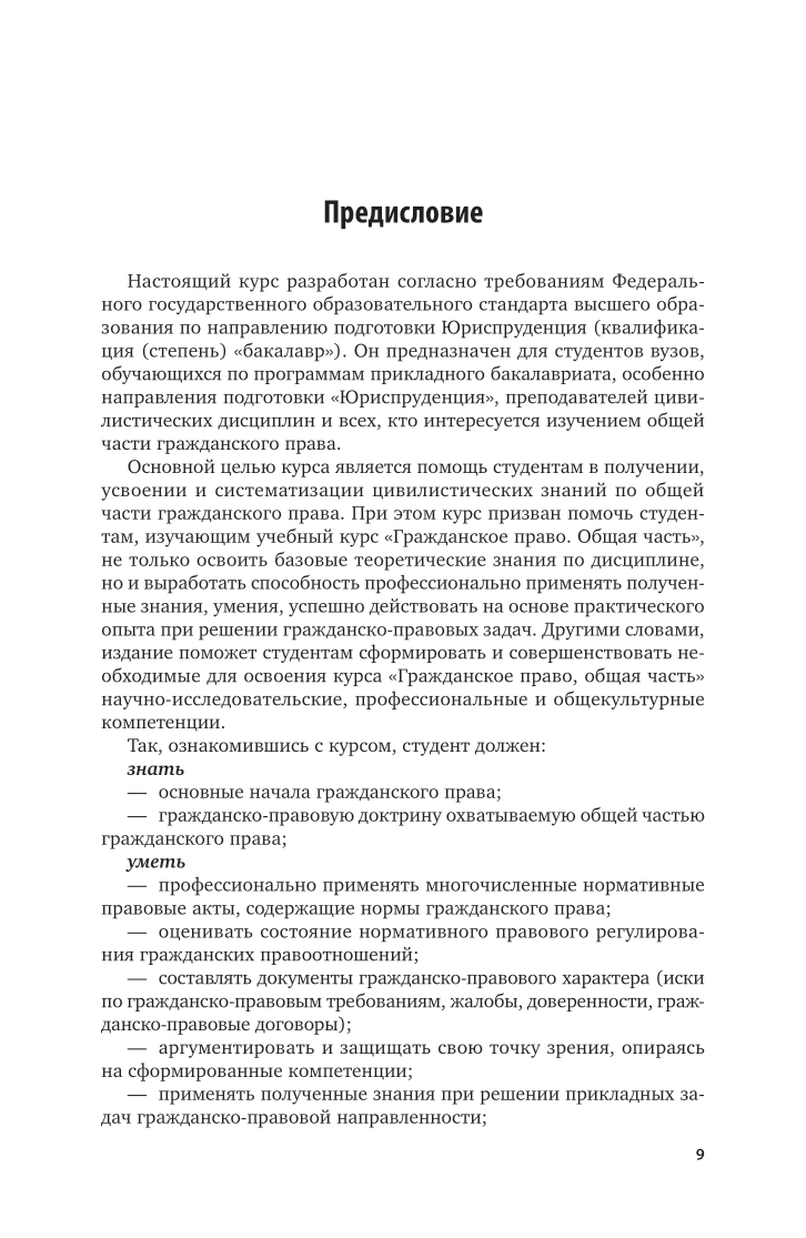 В курсе освещаются положения цивилистической науки, нередко не имеющие прямого законодательного отражения. При изложении материала автор использует не только нормативные правовые акты и цивилистическую доктрину, но и новейшие подходы (точки зрения), выраженные современными учеными в отношении некоторых дискуссионных цивилистических проблем, вопросов, а также на основе судебной практики приводит практические примеры. Наряду с этим в курсе освещены отдельные научные проблемы и вопросы практического характера, возникающие в обществе ввиду проводимой реформы гражданского законодательства. Содержание курса соответствует актуальным требованиям Федерального государственного образовательного стандарта высшего образования. Для студентов, обучающихся по программам прикладного бакалавриата, особенно направления подготовки «Юриспруденция», преподавателей цивилистических дисциплин и всех, кто интересуется изучением общей части гражданского права.