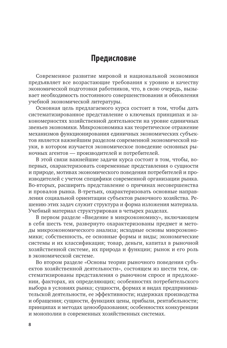 Данный курс состоит из четырех разделов. В первом рассматривается предмет, метод, основные понятия и категории экономической теории: потребности, ресурсы, блага, формы и виды собственности, экономические системы, товар, деньги, капитал, рынок. Во втором излагаются основы теории рыночного поведения потребителей и производителей. Охарактеризованы факторы, определяющие величину и динамику спроса и предложения, их эластичности; условия, характеризующие потребительские предпочтения и потребительский выбор, а также оптимальные размеры издержек и объемов производства в краткосрочном и долгосрочном периоде. В третьем рассматриваются механизмы функционирования рынков факторов производства и формирования доходов. В четвертом разделе анализируются «несовершенство и провалы рынка», а также необходимость его регулирования и социальной ориентации. Соответствует актуальным требованиям федерального государственного образовательного стандарта высшего образования. Для студентов, обучающихся по направлению «Экономика» по уровню подготовки специалитета и бакалавриата.