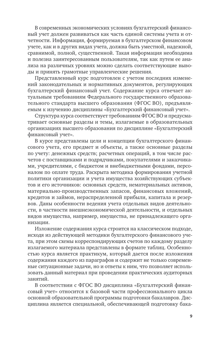 В курсе рассматриваются актуальные вопросы бухгалтерского финансового учета. В первом модуле - «Организация бухгалтерского финансового учета» - раскрыты следующие вопросы: предмет и объекты бухгалтерского финансового учета, цели и концепции финансового учета, система нормативного регулирования учета в Российской Федерации и программа реформирования учета и отчетности в условиях перехода на МСФО. Второй модуль - «Методика учета имущества организации и его источников» - посвящен учету денежных средств, долгосрочных инвестиций, основных средств, нематериальных активов, материально-производственных запасов, финансовых вложений, оплаты труда, готовой продукции и ее реализации, капитала, фондов и резервов, финансовых результатов, кредитов и займов, расчетных операций, забалансовых счетов, а также внешнеэкономической деятельности. Курс содержит примеры часто встречающихся в деятельности коммерческих организаций хозяйственных операций, а также профессиональные компетенции по каждой теме, а также контрольные вопросы. Курс включает дополнительный практический материал, размещенный на сайте Соответствует актуальным требованиям федерального государственного образовательного стандарта высшего образования. Курс ориентирован на студентов бакалавриата и специалитета, обучающихся по направлению «Экономика» и по специальности «Бухгалтерский учет, анализ и аудит», а также специалистов-практиков.