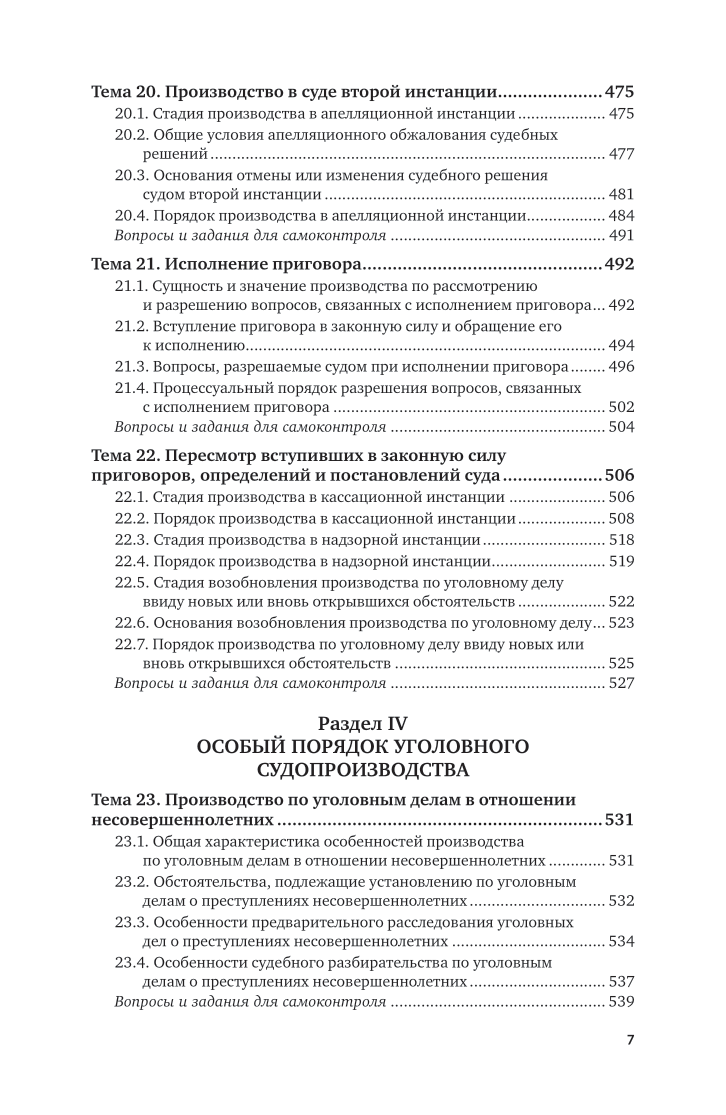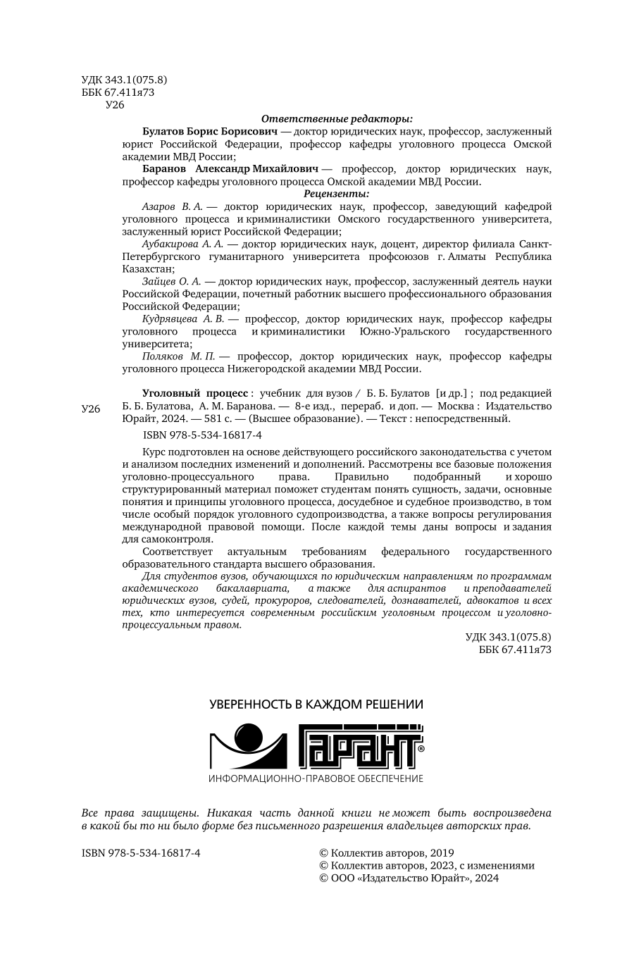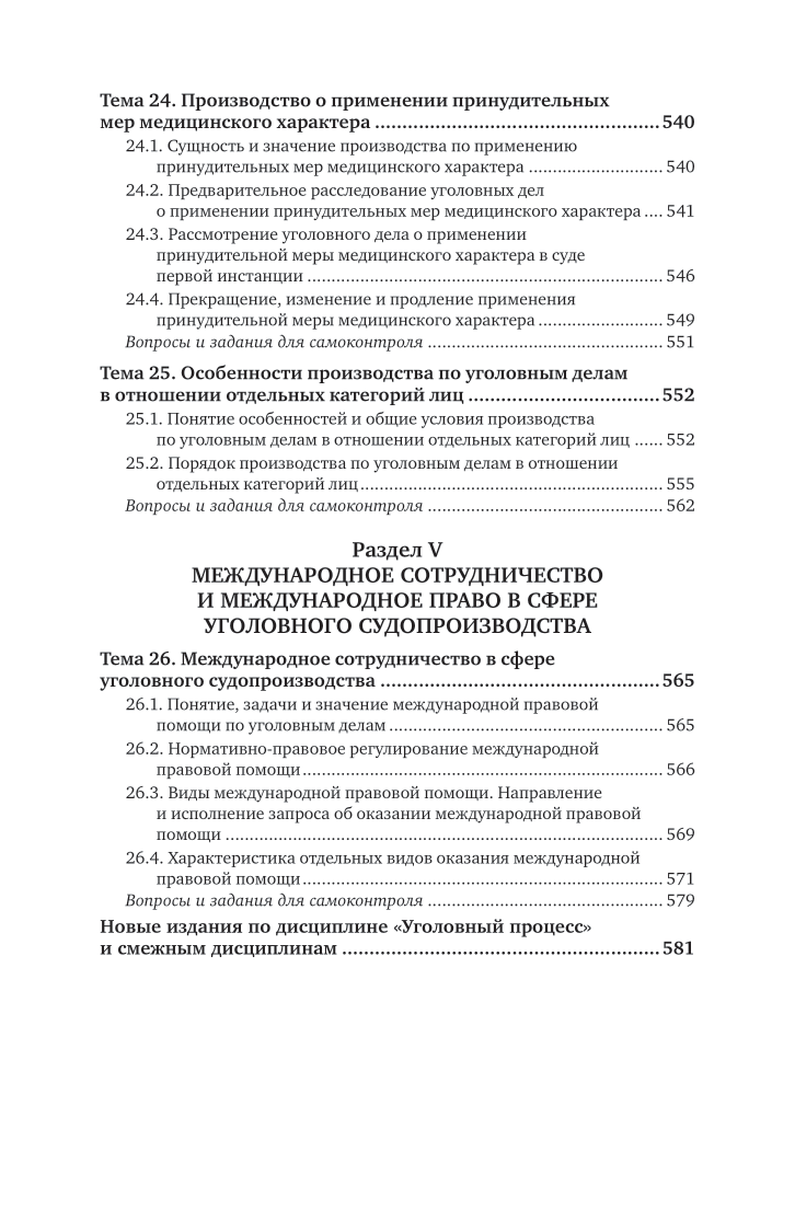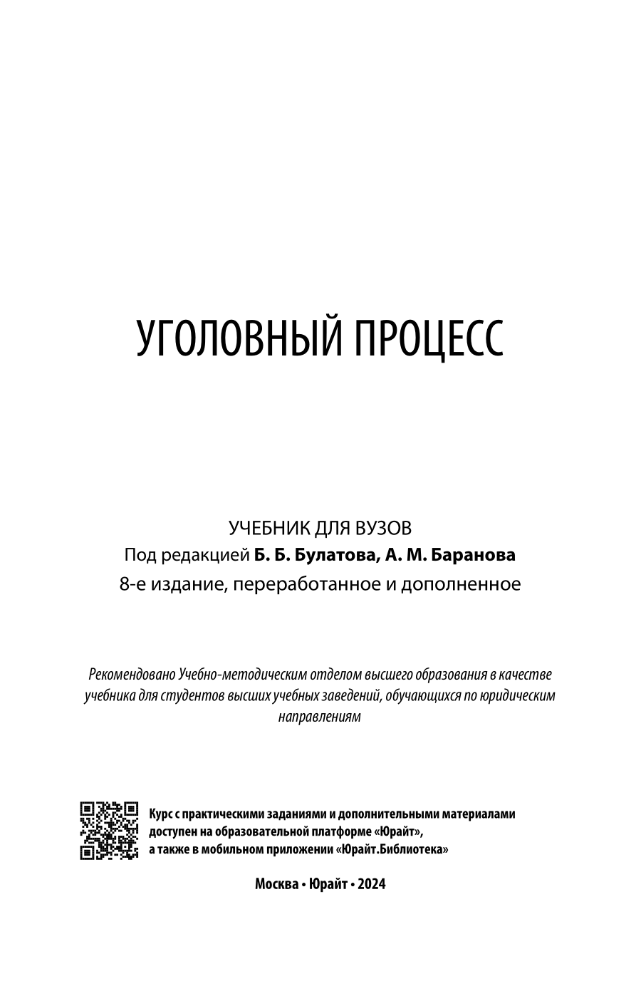 Курс подготовлен на основе действующего российского законодательства с учетом и анализом последних изменений и дополнений. Рассмотрены все базовые положения уголовно-процессуального права. Правильно подобранный и хорошо структурированный материал поможет студентам понять сущность, задачи, основные понятия и принципы уголовного процесса, досудебное и судебное производство, в том числе особый порядок уголовного судопроизводства, а также вопросы регулирования международной правовой помощи. После каждой темы даны вопросы и задания для самоконтроля. Соответствует актуальным требованиям федерального государственного образовательного стандарта высшего образования. Для студентов вузов, обучающихся по юридическим направлениям по программам академического бакалавриата, а также для аспирантов и преподавателей юридических вузов, судей, прокуроров, следователей, дознавателей, адвокатов и всех тех, кто интересуется современным российским уголовным процессом и уголовно-процессуальным правом.