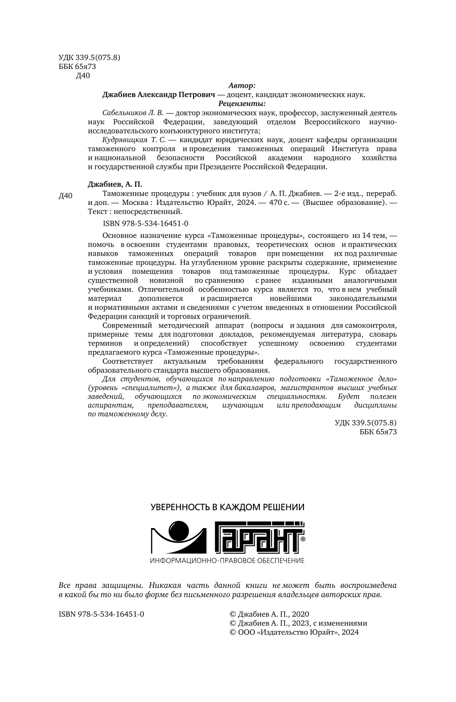 Таможенные процедуры 2-е изд. пер. и доп. Учебник для вузов (Александр Петрович Джабиев); ЮРАЙТ, 2023