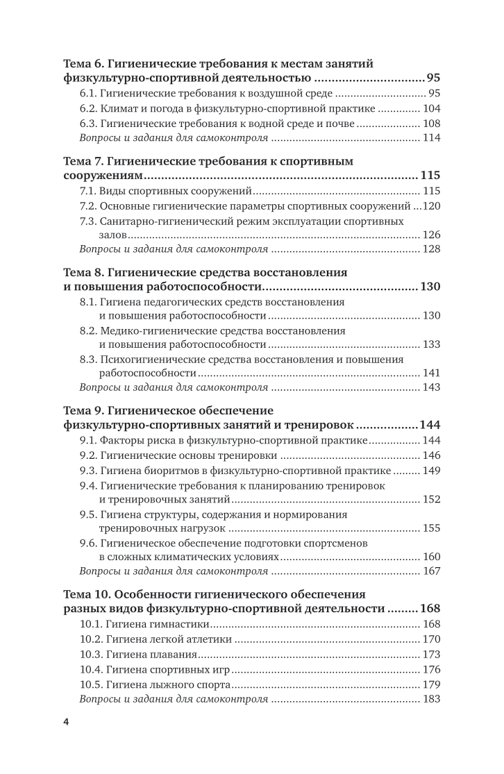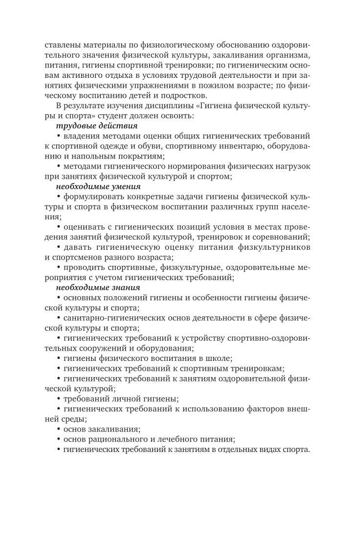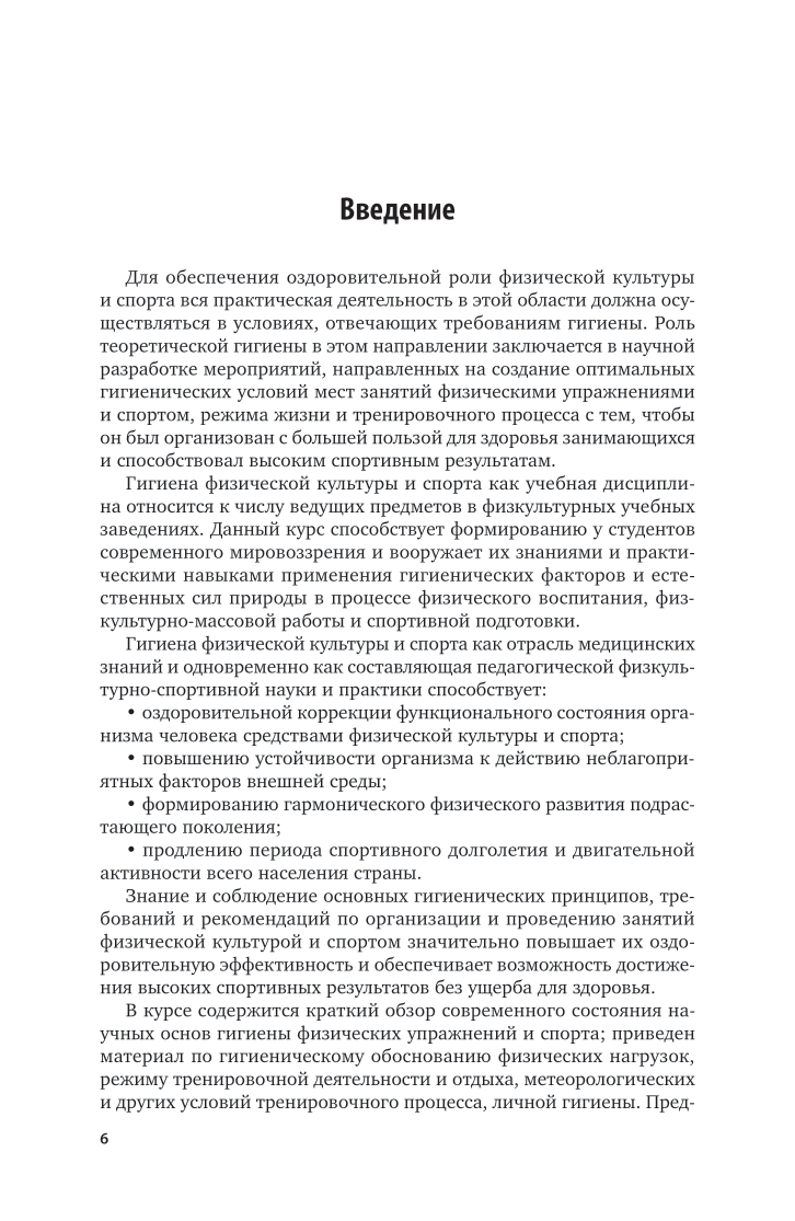Курс «Гигиена физической культуры и спорта» раскрывает цель, задачи и средства гигиены в области физической культуры и спорта, основы гигиены в профилактике заболеваний и здорового образа жизни, основы гигиены питания лиц, занимающихся физкультурой и спортом, гигиенические требования к местам занятий физкультурно-спортивной деятельностью, гигиенические средства восстановления, особенности гигиенического обеспечения разных видов физкультурно-спортивной деятельности, основы психогигиены и психопрофилактики в физкультурной и спортивной практике. Соответствует актуальным требованиям Федерального государственного образовательного стандарта высшего образования. Предназначено для студентов высших учебных заведений, обучающихся по направлениям: Педагогическое образование (Физическая культура); Педагогическое образование (Физическая культура)(прикладной бакалавриат); Педагогическое образование (с двумя профилями подготовки)(Физическая культура, Безопасность жизнедеятельности); Педагогическое образование (с двумя профилями подготовки)(Физическая культура, Дополнительное образование); Физическая культура (Тренер); Адаптивная физическая культура (Тренер по адаптивной физической культуре).