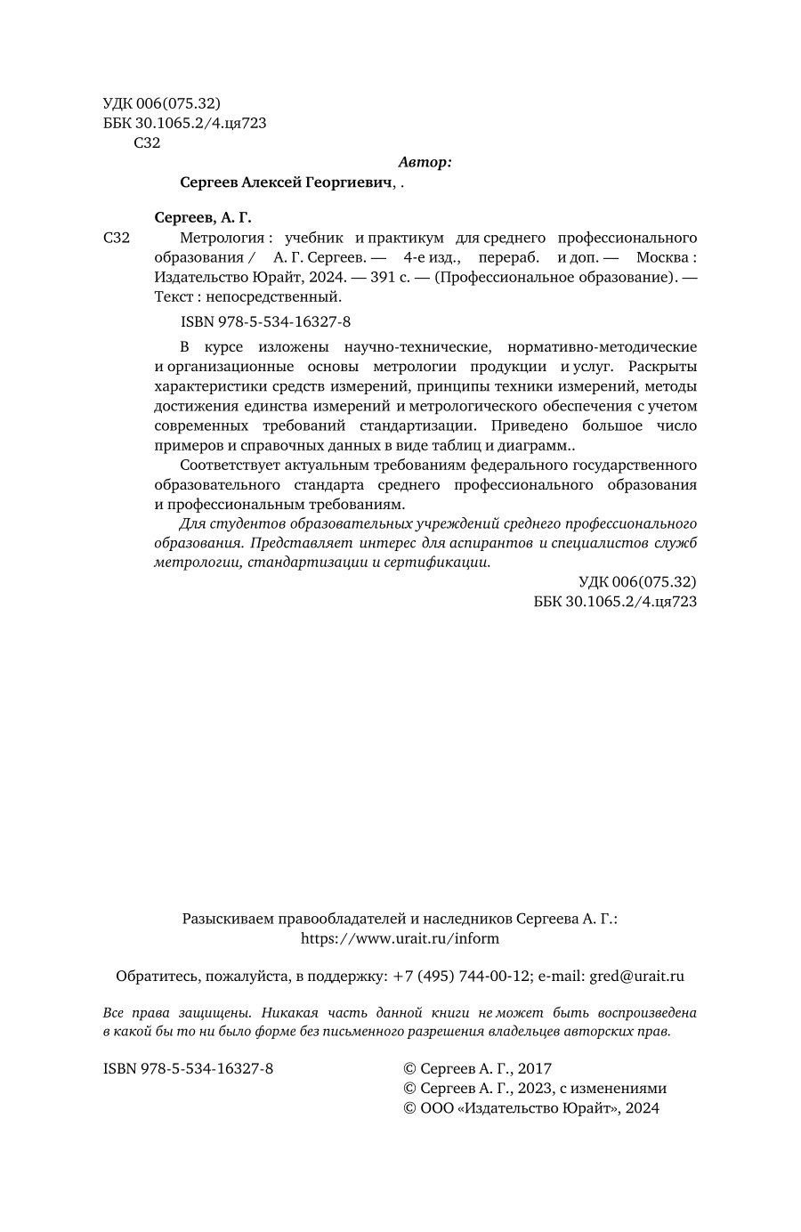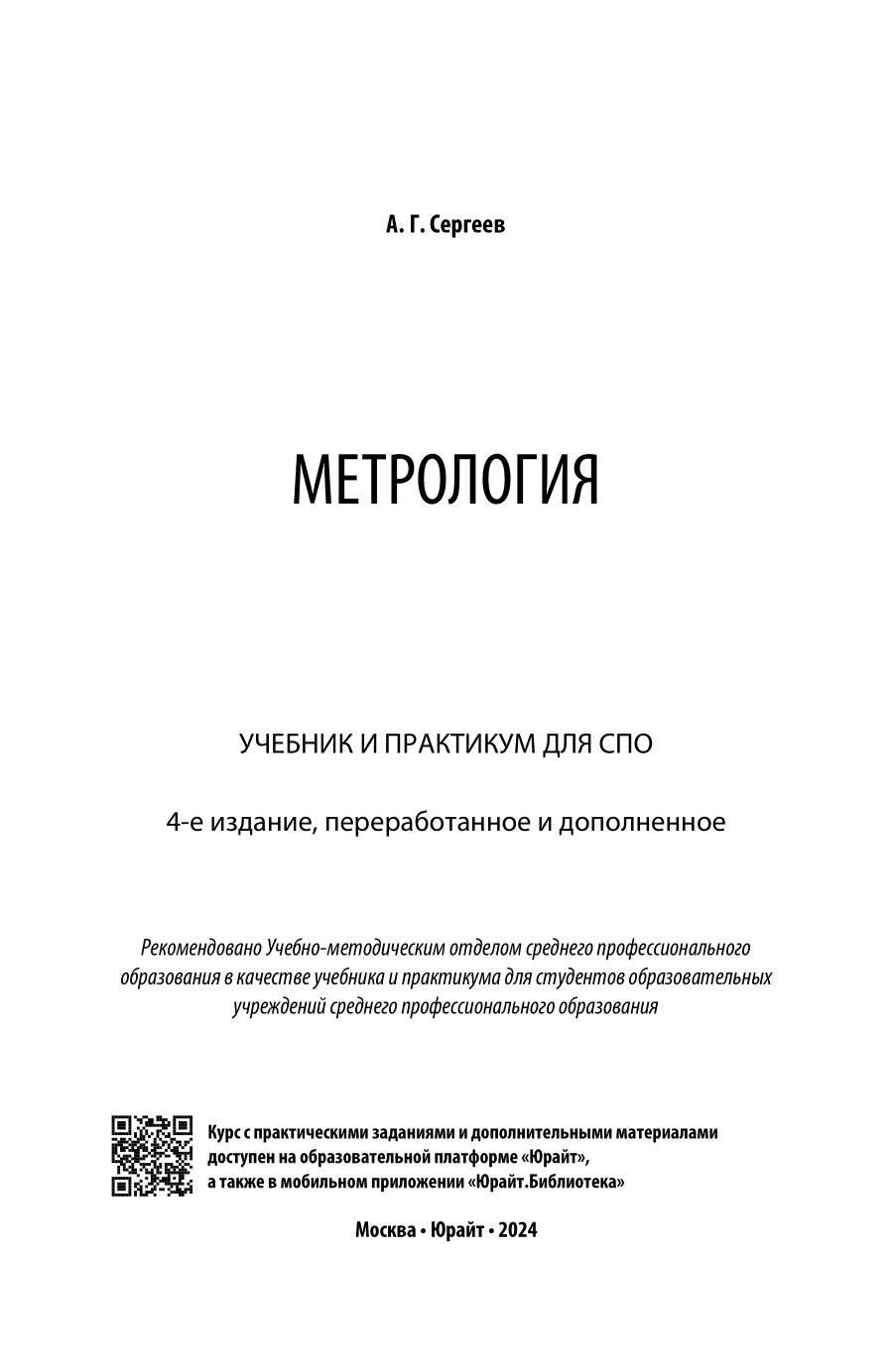 Метрология 4-е изд. пер. и доп. Учебник и практикум для СПО (Алексей Георгиевич Сергеев); ЮРАЙТ, 2023