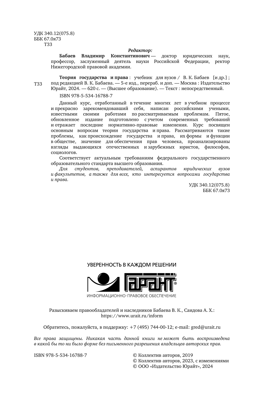 Данный курс, отработанный в течение многих лет в учебном процессе и прекрасно зарекомендовавший себя, написан российскими учеными, известными своими работами по рассматриваемым проблемам. Пятое, обновленное издание подготовлено с учетом современных требований и отражает последние нормативно-правовые изменения. Курс посвящен основным вопросам теории государства и права. Рассматриваются такие проблемы, как происхождение государства и права, их формы и функции в обществе, значение для обеспечения прав человека, проанализированы взгляды выдающихся отечественных и зарубежных юристов, философов, социологов. Соответствует актуальным требованиям федерального государственного образовательного стандарта высшего образования. Для студентов, преподавателей, аспирантов юридических вузов и факультетов, а также для всех, кто интересуется вопросами государства и права.