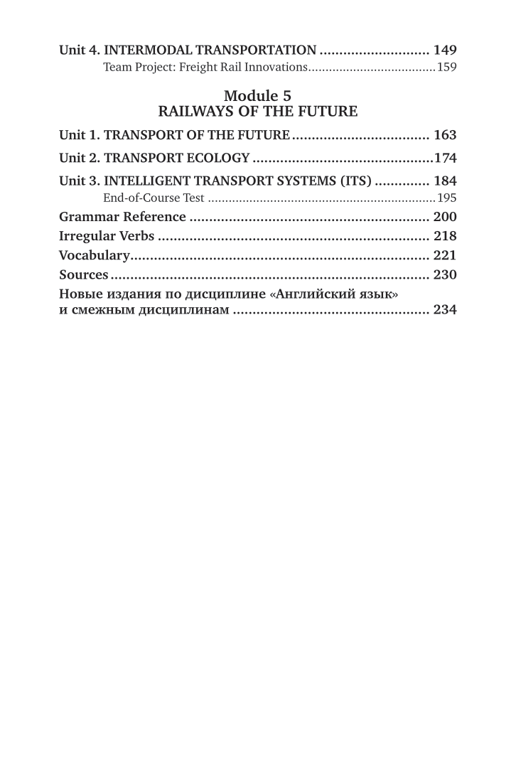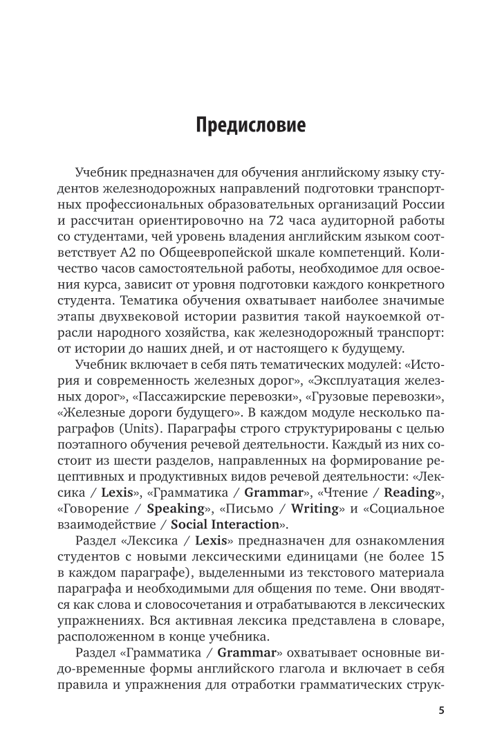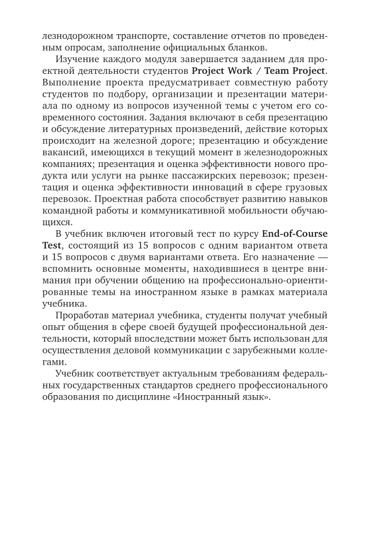 Учебник предназначен для студентов образовательных учреждений среднего профессионального образования железнодорожных направлений подготовки с уровнем владения английским языком не ниже А2. Основная цель учебника - формирование иноязычной профессиональной коммуникативной компетенции, включая развитие умений разных видов чтения, говорения, письма и социального взаимодействия на основе тем, связанных с будущей специальностью студентов. В учебник включены задания для проектной деятельности студентов и итоговый тест по курсу. Учебник предусматривает активную тренировку системы видо-временных форм английских глаголов и снабжен грамматическим справочником. Учебник также может быть использован всеми желающими расширить возможности своего общения на английском языке, включив в него темы, связанные с железнодорожным транспортом. Учебник соответствует актуальным требованиям федеральных государственных стандартов среднего образования по дисциплине «Иностранный язык»