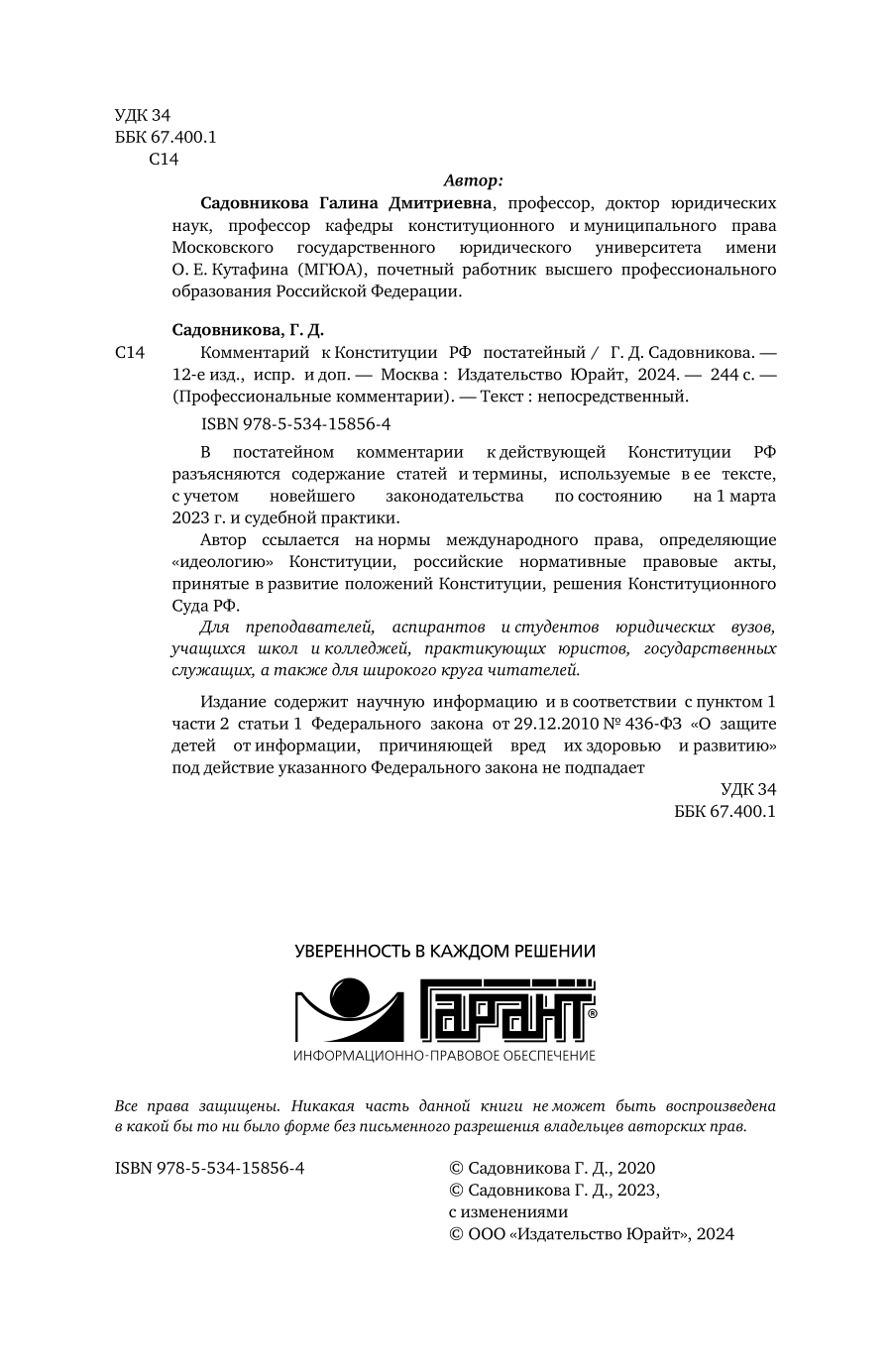Сервис сравнения цен СкидкаГИД предлагает сравнить цены на товар «Книга: Комментарий к Конституции РФ постатейный 12-е изд. испр. и доп (Галина Дмитриевна Садовникова); ЮРАЙТ, 2023»