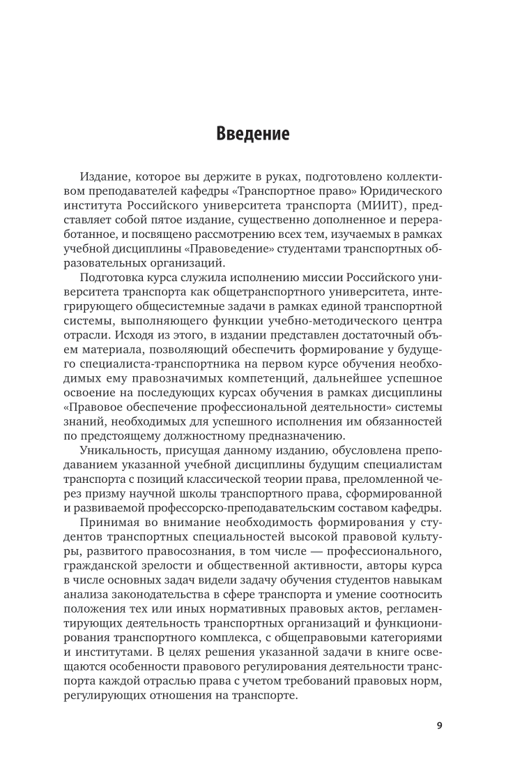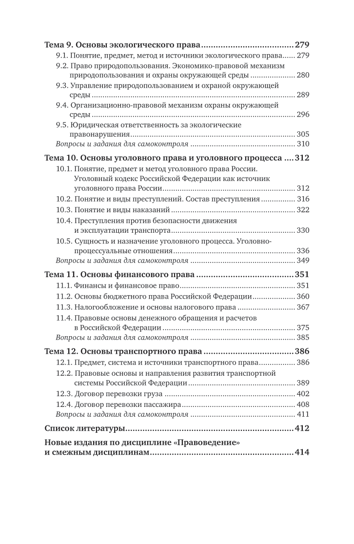 В издании в систематизированной форме изложены дидактические блоки, включенные в курс «Правоведение», ориентированный на специалистов транспортных ссузов и содержащий материал, необходимый и достаточный для формирования у будущих специалистов в области транспорта компетенций правовой направленности, позволяющих обеспечить успешное выполнение ими в последующем обязанностей по предстоящему должностному предназначению в условиях цифровизации экономики и транспортной логистики. Представленный материал отражает все современные тенденции динамично развивающегося российского законодательства, последние изменения в нормативных правовых актах, регулирующих деятельность в сфере транспорта. Учтены поправки в Конституцию Российской Федерации в соответствии с Законами РФ от 04.10.2022 № 5-ФКЗ, от 04.10.2022 № 6-ФКЗ, от 04.10.2022 № 7-ФКЗ, от 04.10.2022 № 8-ФКЗ. Соответствует актуальным требованиям федерального государственного образовательного стандарта среднего профессионального образования и профессиональным требованиям. Издание может представлять интерес не только для студентов образовательных учреждений среднего профессионального образования, но и для научных работников, преподавателей, специалистов и всех, кто интересуется вопросами права и его связями с транспортом.