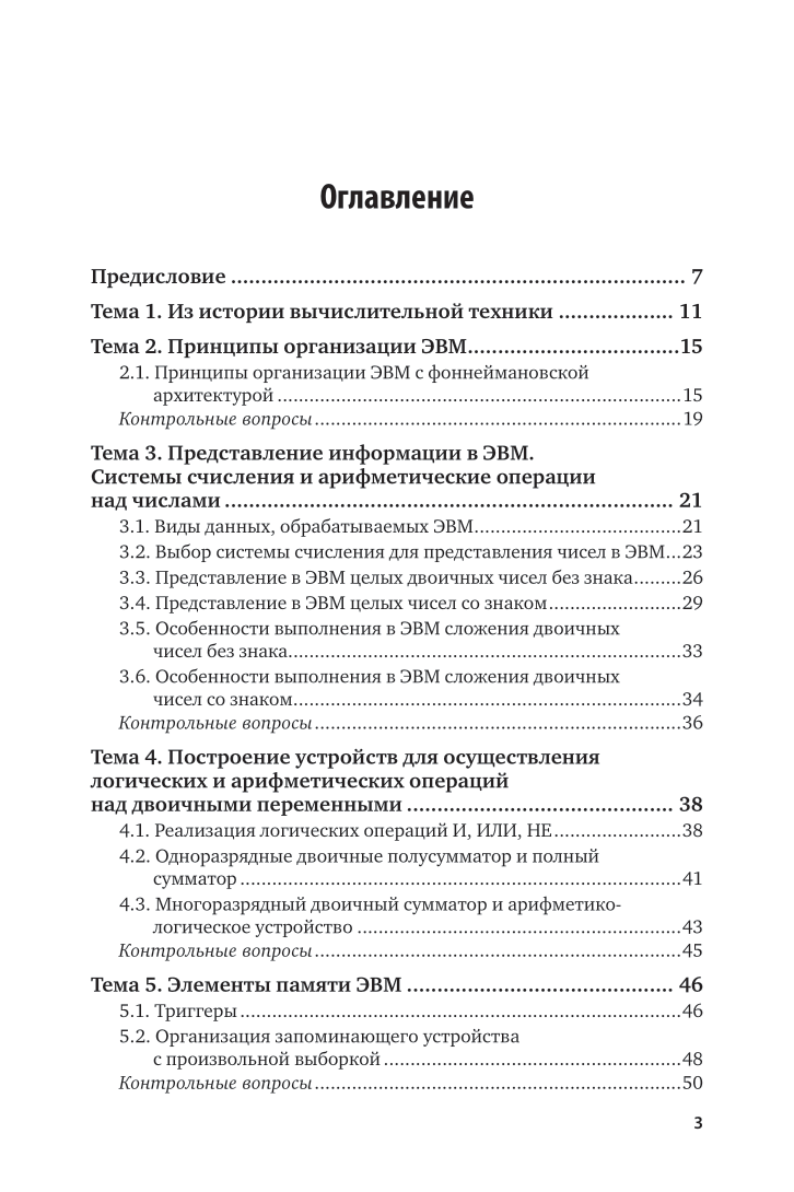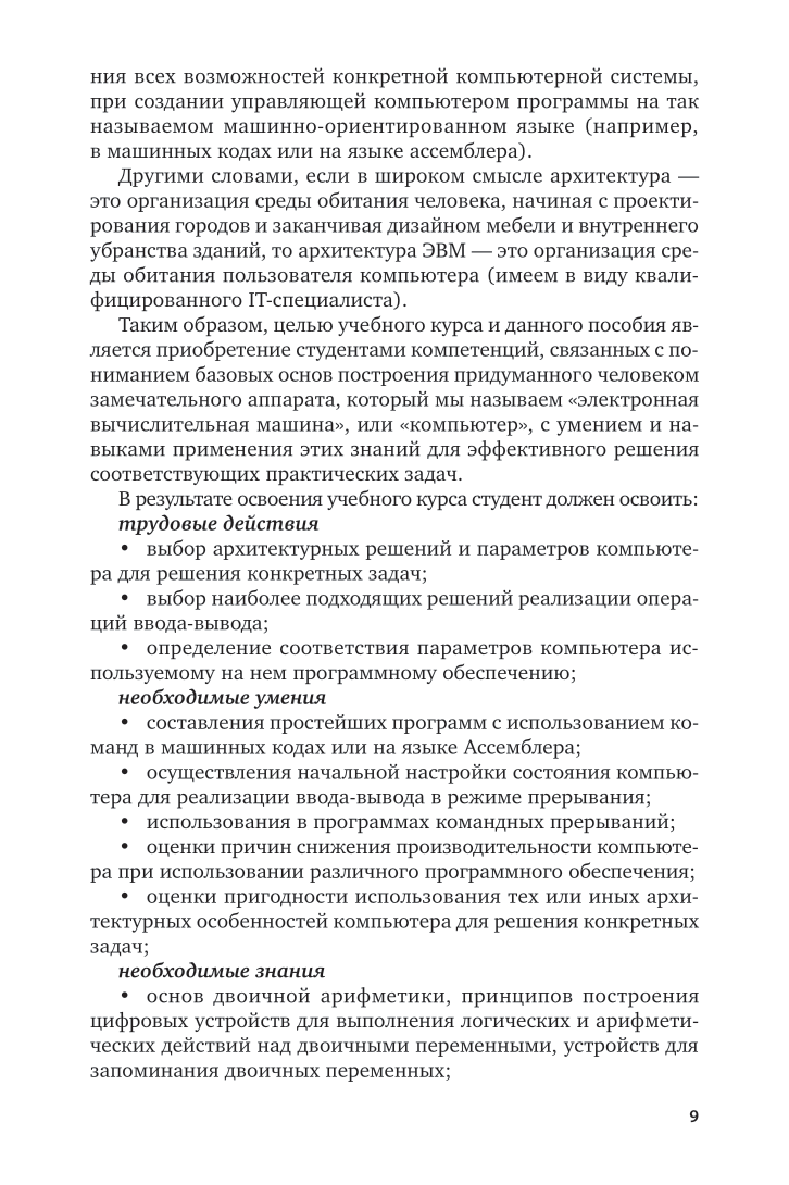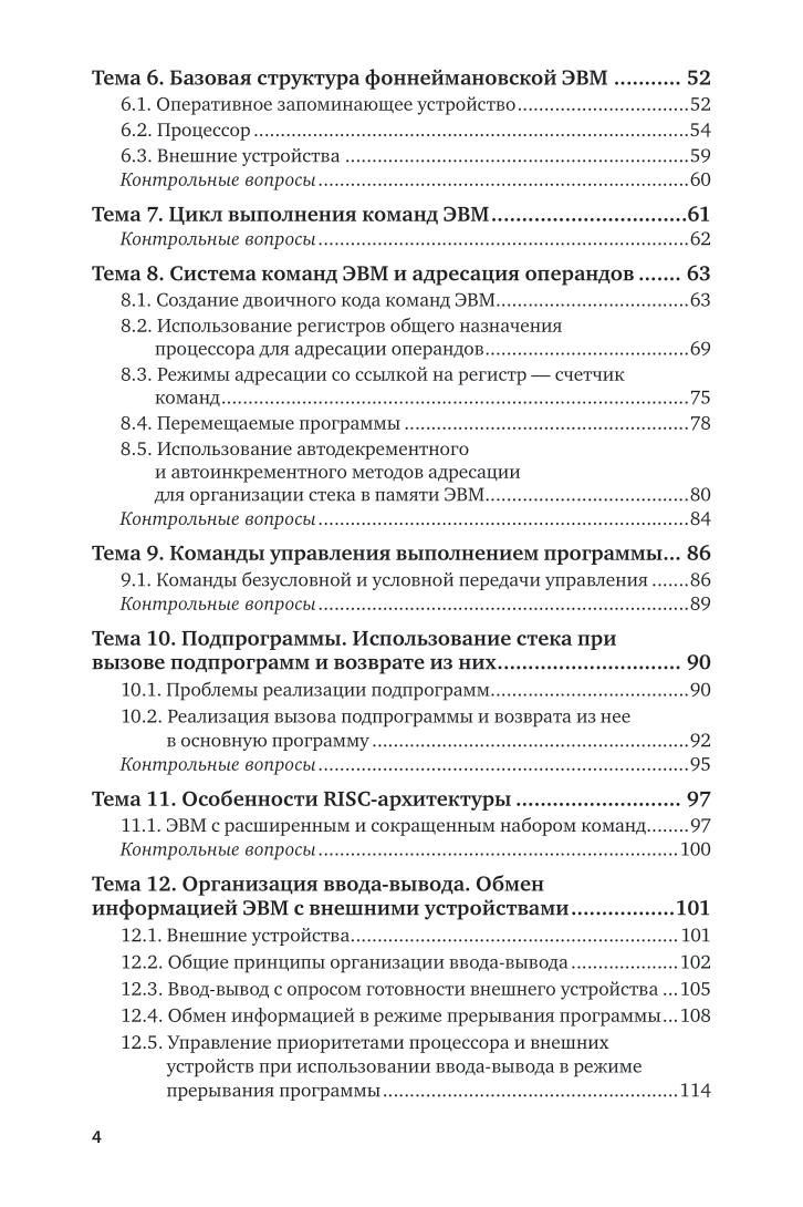 Курс посвящен рассмотрению архитектурных принципов построения ЭВМ: структуры центрального процессора, системы команд, организации ввода-вывода, управления памятью, способов повышения производительности ЭВМ. Большое внимание обращается на то, каким образом особенности построения компьютера вытекают из базовых принципов, которые сейчас принято называть фоннеймановскими, а реализуемую на их основе архитектуру ЭВМ - фоннеймановской архитектурой. Курс предназначен для использования в качестве учебного материала по дисциплинам, посвященным изучению архитектуры ЭВМ и вычислительных систем и являющимся вводными для цикла дисциплин, посвященных программированию и использованию вычислительной и микропроцессорной техники, изучаемым по образовательным программам, связанным с информационными технологиями.