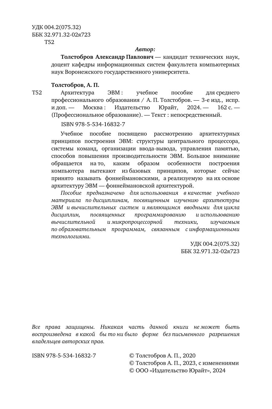 Архитектура ЭВМ 3-е изд. испр. и доп. Учебное пособие для СПО (Александр Павлович Толстобров); ЮРАЙТ, 2023
