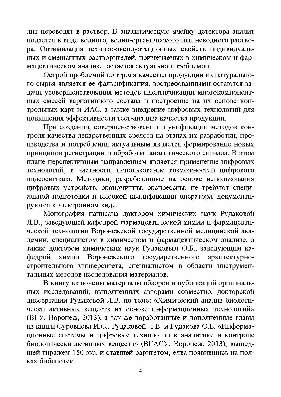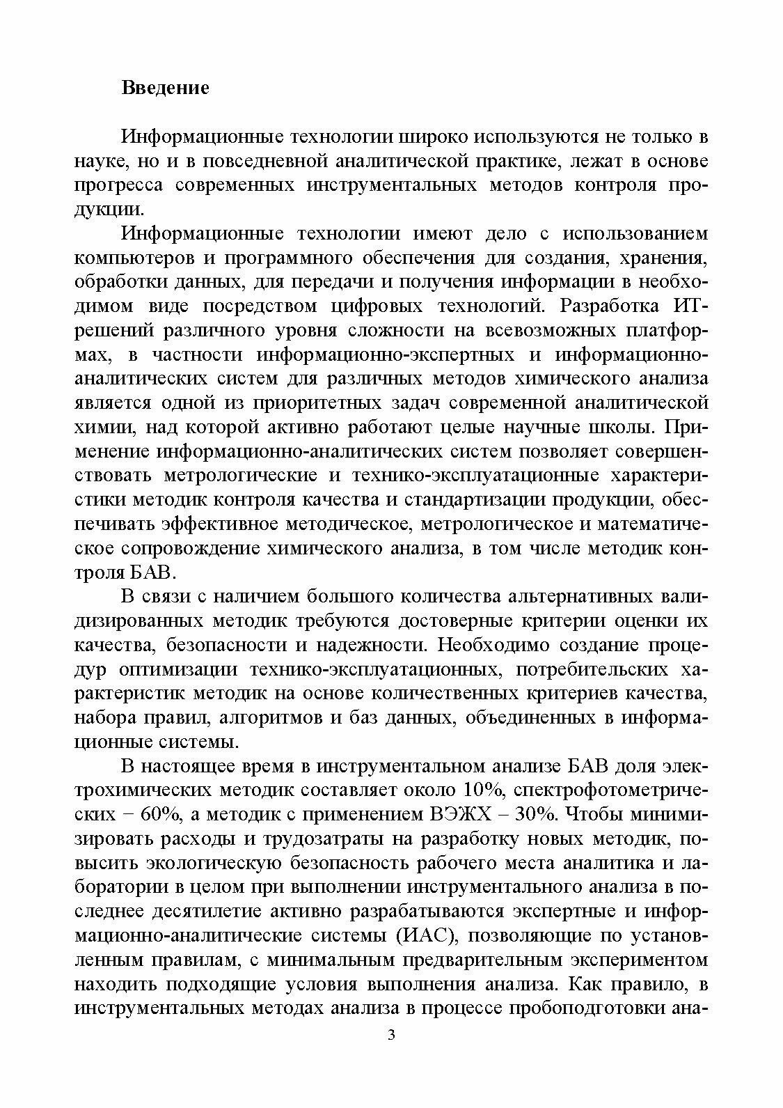 В монографии рассмотрены возможности применения информационноаналитических систем, цифровых технологий, унифицированных критериев, интегральных показателей и алгоритмов их использования для усовершенствования инструментальных методик химического анализа растворов биологически активных веществ, показаны примеры решения с помощью информационно-аналитических систем задач идентификации и проверки подлинности многокомпонентной продукции с вариативным составом, описаны способы обработки многопараметрического аналитического сигнала, получаемого от мультисенсорных, хроматографических или спектроскопических систем. Книга содержит богатый справочный материал и может представлять интерес не только для аспирантов и студентов естественно-научных, медицинских, инженерных профилей подготовки в качестве учебного пособия, но и для специалистов, работающих в соответствующих областях науки и промышленности.