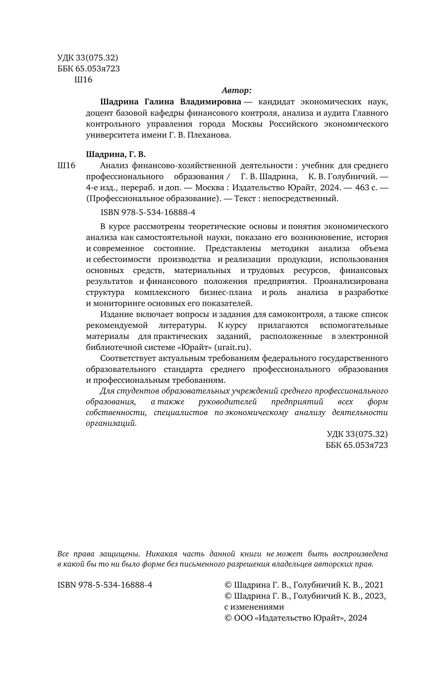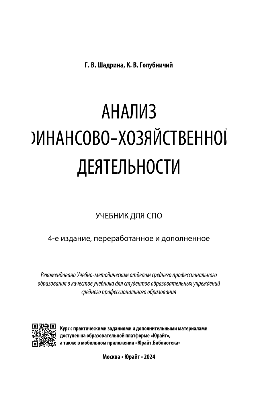 Анализ финансово-хозяйственной деятельности 4-е изд. пер. и доп. Учебник для СПО (Галина Владимировна Шадрина); ЮРАЙТ, 2023