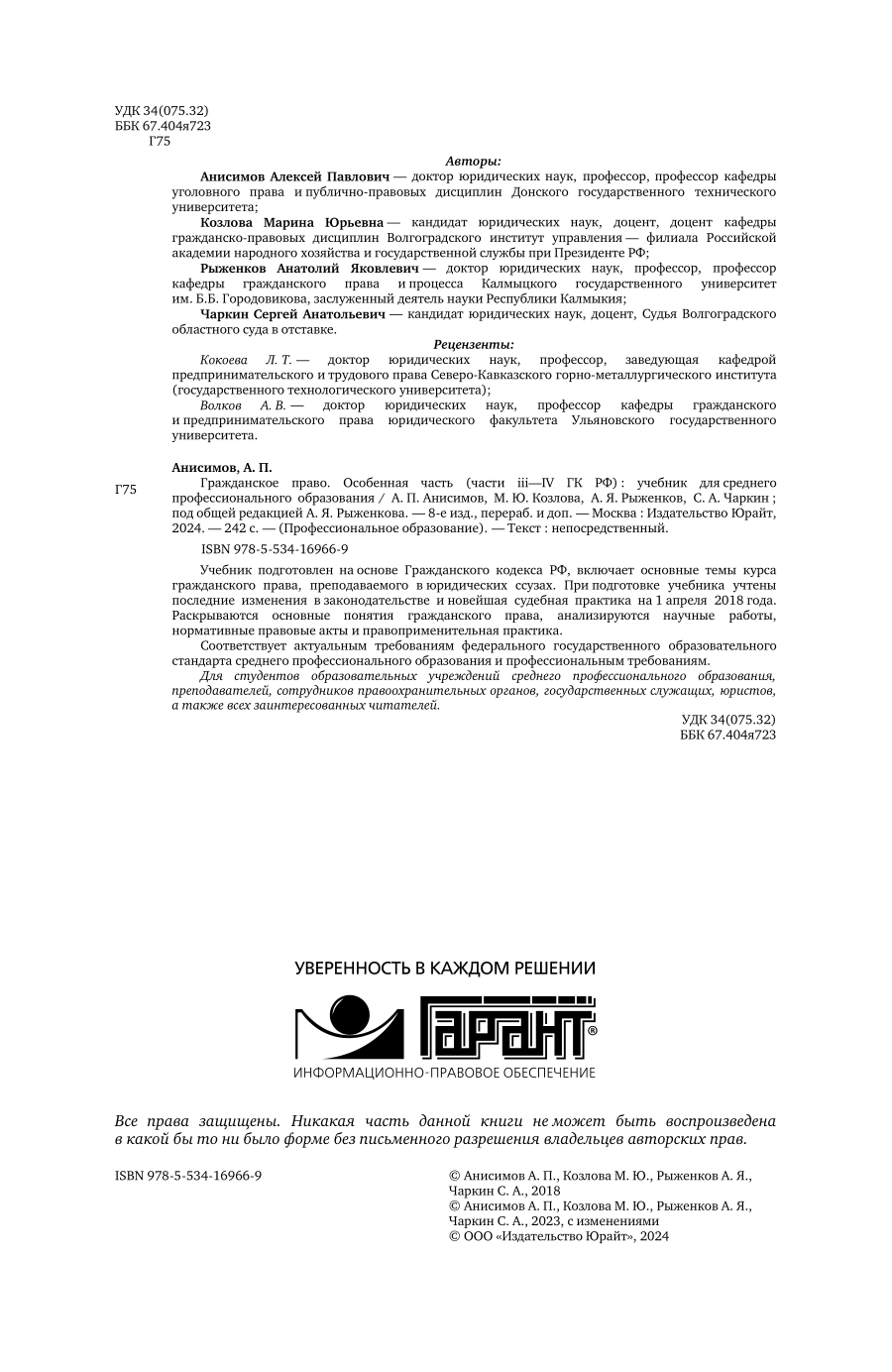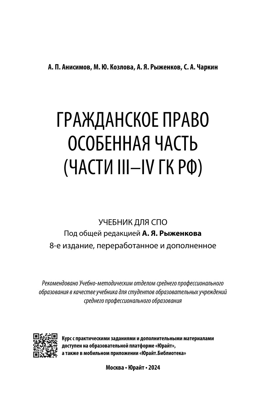 Гражданское право. Особенная часть (части iii-IV ГК РФ) 8-е изд. пер. и доп. Учебник для СПО (Алексей Павлович Анисимов); ЮРАЙТ, 2023