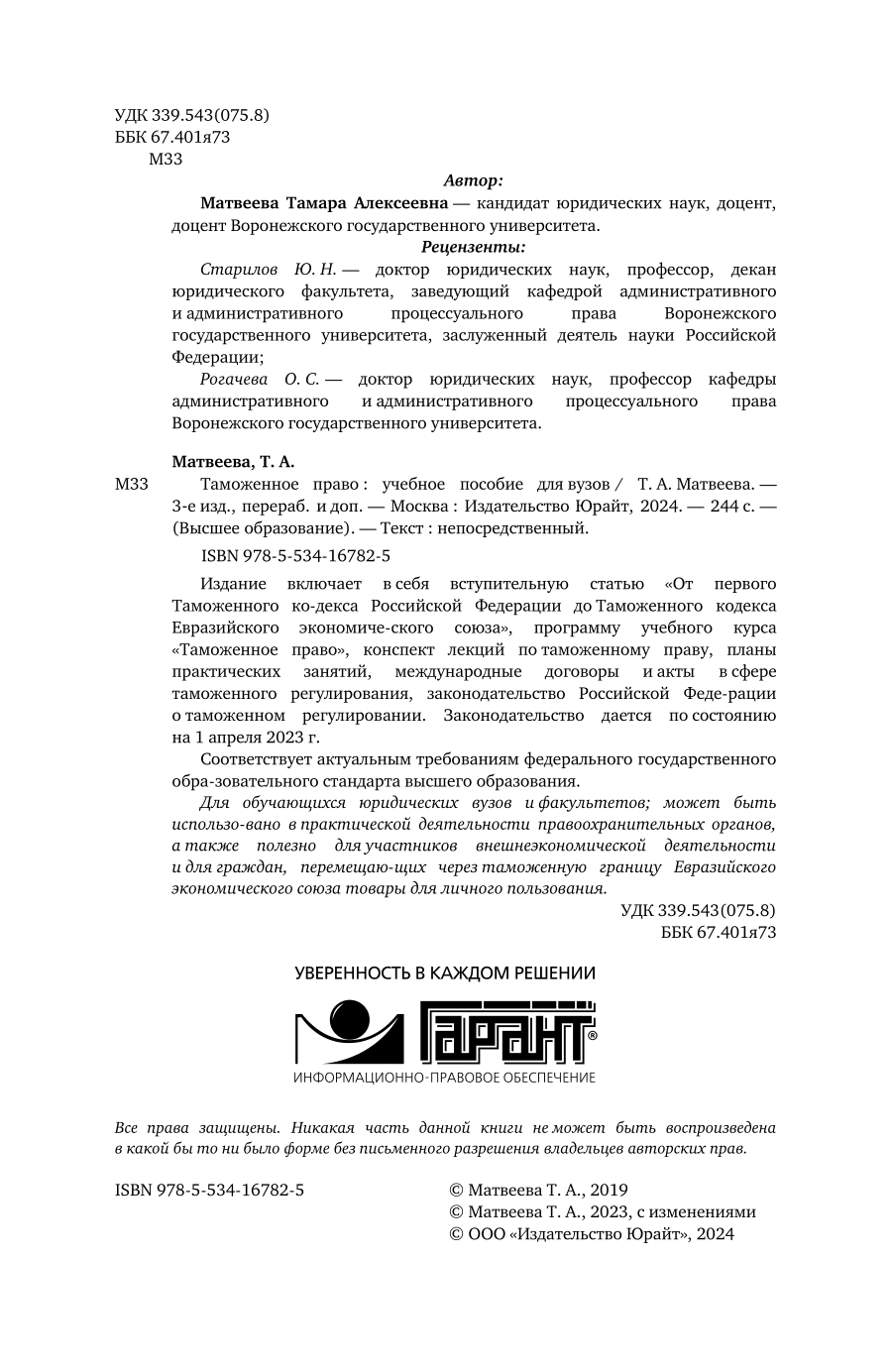 Таможенное право 3-е изд. пер. и доп. Учебное пособие для вузов (Тамара Алексеевна Матвеева); ЮРАЙТ, 2023