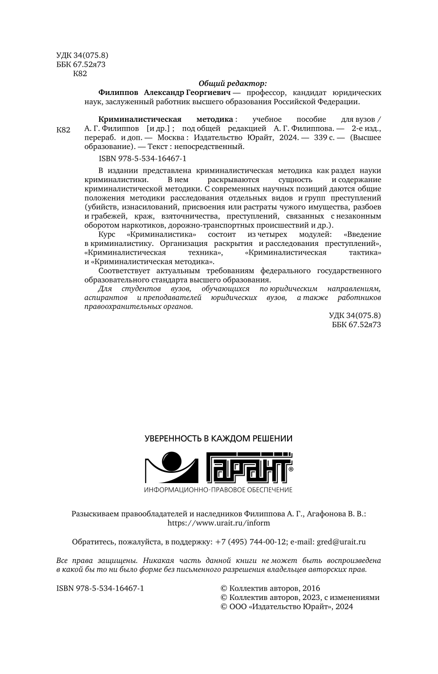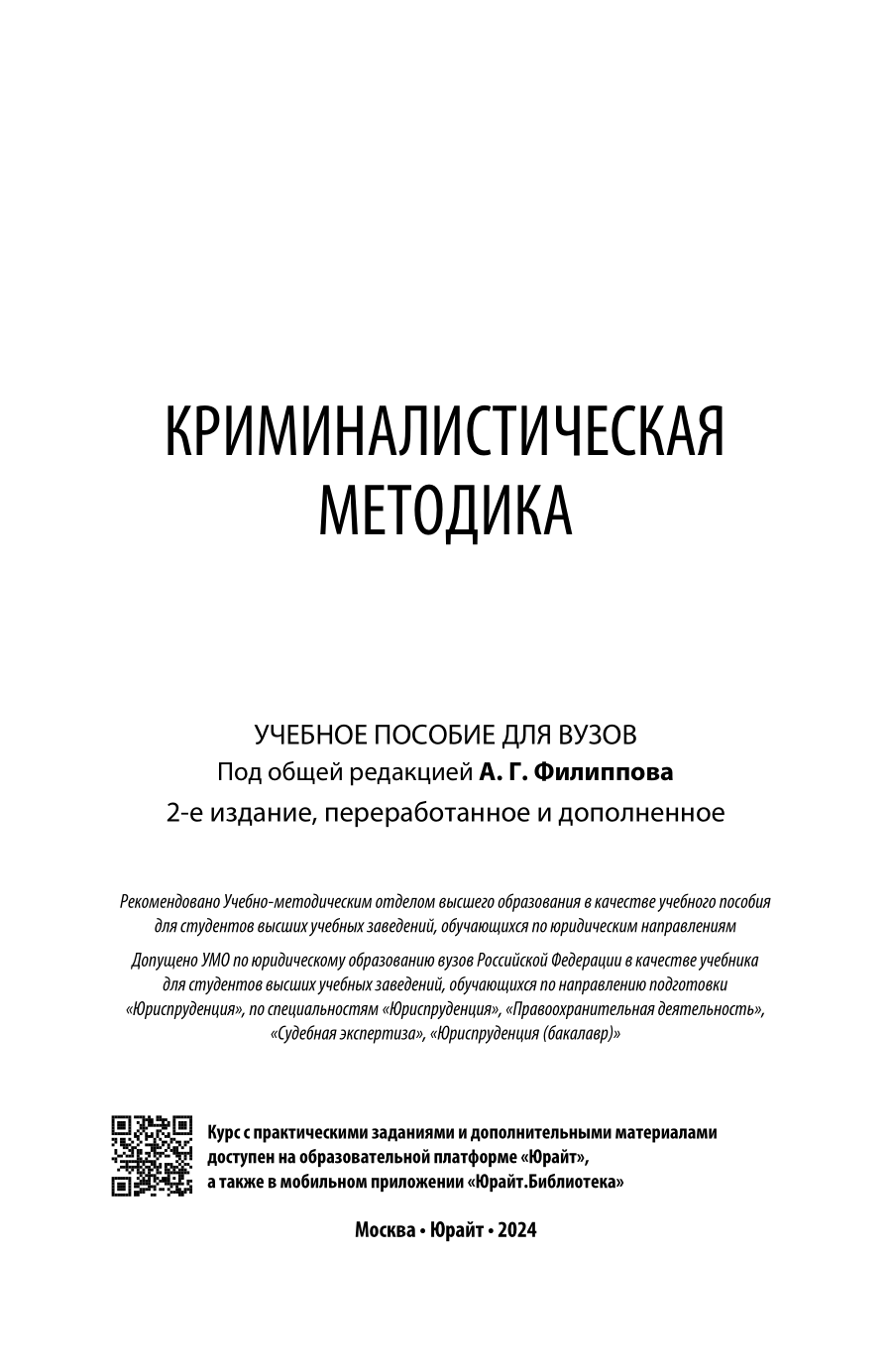 Криминалистическая методика 2-е изд. пер. и доп. Учебное пособие для вузов (Филиппов Александр Георгиевич, Агафонов Владимир Васильевич, Посельская Людмила Николаевна, Шаров Александр Васильевич, Чистова Любовь Евгеньевна, Проткин Алексей Алексеевич, Бурнашев Николай Александрович, Кузнецов Александр Александрович, Кушниренко Светлана Петровна, Ялышев Станислав Алимович), 2024