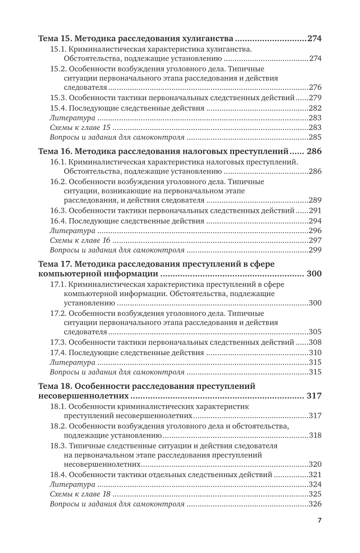 В издании представлена криминалистическая методика как раздел науки криминалистики. В нем раскрываются сущность и содержание криминалистической методики. С современных научных позиций даются общие положения методики расследования отдельных видов и групп преступлений (убийств, изнасилований, присвоения или растраты чужого имущества, разбоев и грабежей, краж, взяточничества, преступлений, связанных с незаконным оборотом наркотиков, дорожно-транспортных происшествий и др.). Курс «Криминалистика» состоит из четырех модулей: «Введение в криминалистику. Организация раскрытия и расследования преступлений», «Криминалистическая техника», «Криминалистическая тактика» и «Криминалистическая методика». Соответствует актуальным требованиям федерального государственного образовательного стандарта высшего образования. Для студентов вузов, обучающихся по юридическим направлениям, аспирантов и преподавателей юридических вузов, а также работников правоохранительных органов.