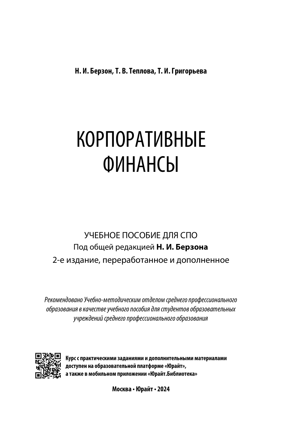 Корпоративные финансы 2-е изд. пер. и доп. Учебное пособие для СПО (Николай Иосифович Берзон); ЮРАЙТ, 2023