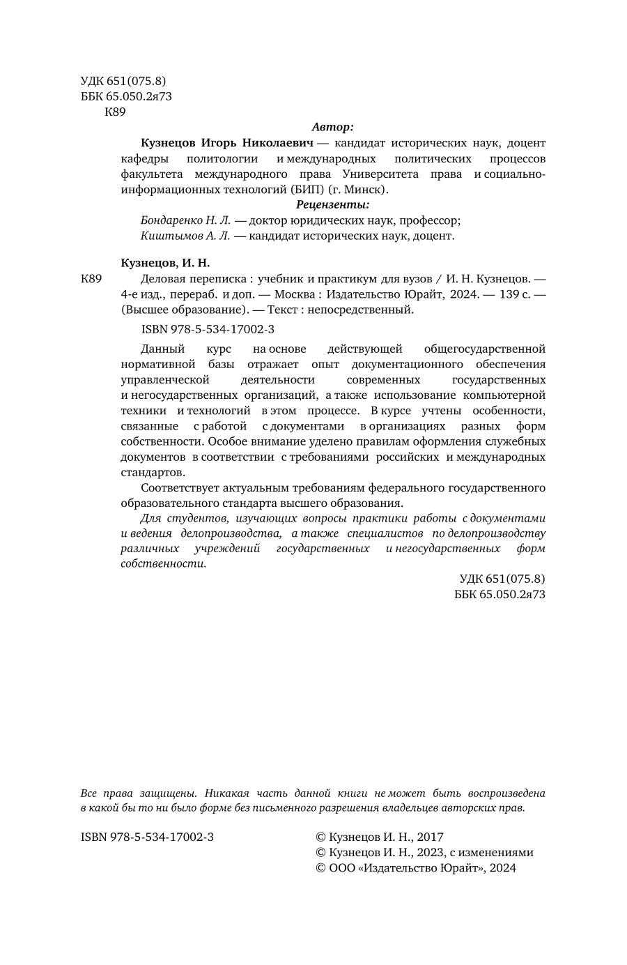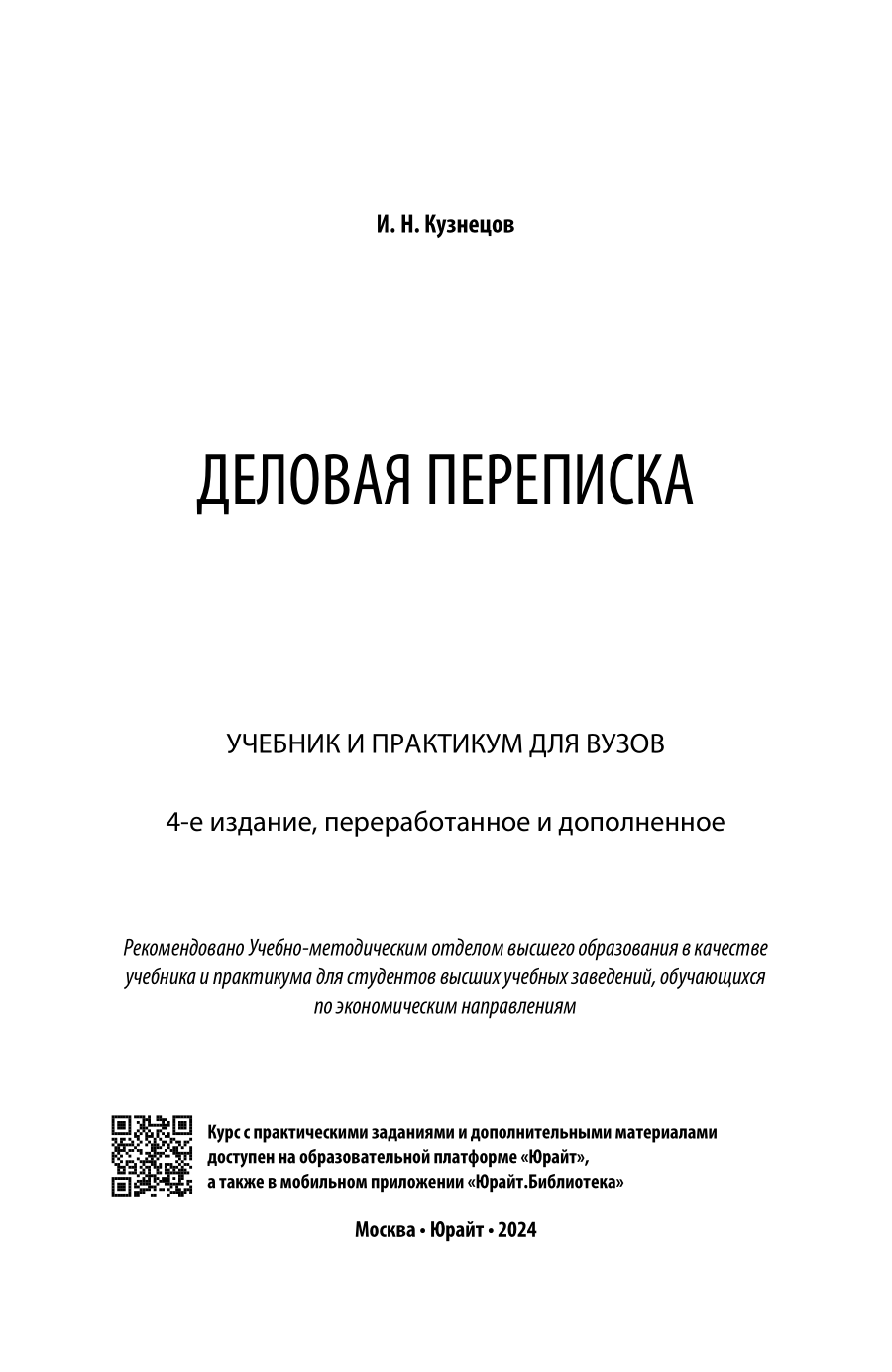 Деловая переписка 4-е изд. пер. и доп. Учебник и практикум для вузов (Игорь Николаевич Кузнецов); ЮРАЙТ, 2023