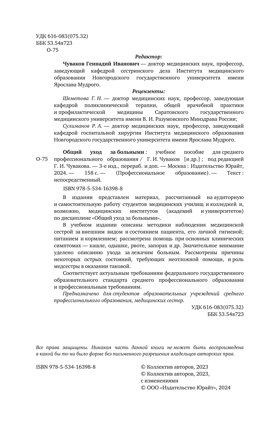 Общий уход за больными 3-е изд. пер. и доп. Учебное пособие для СПО (Геннадий Иванович Чуваков); ЮРАЙТ, 2023