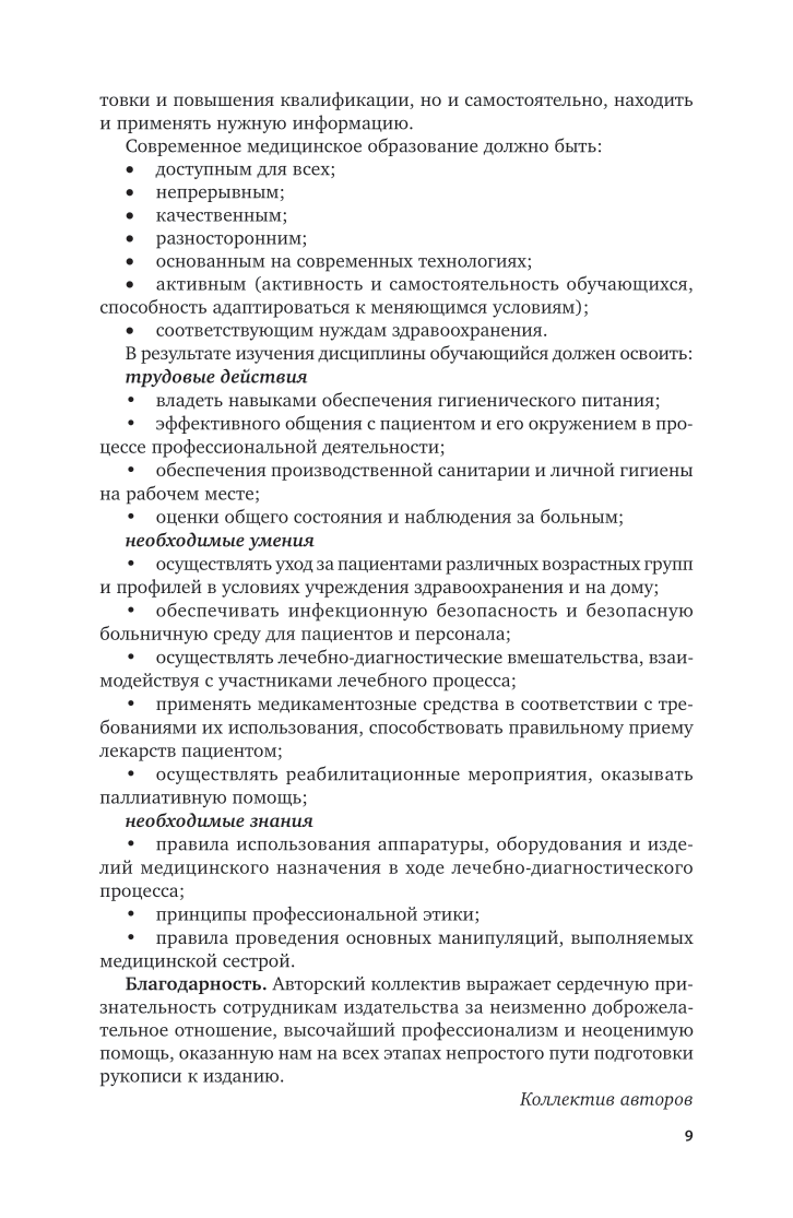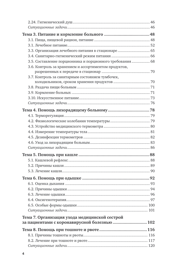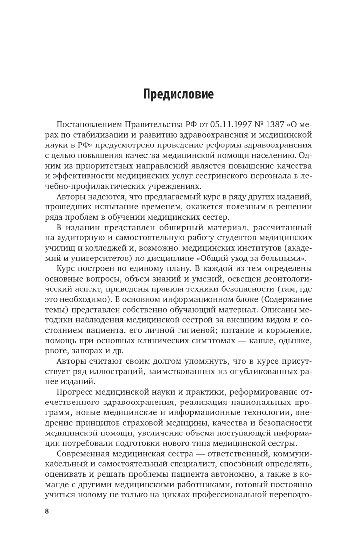 В издании представлен материал, рассчитанный на аудиторную и самостоятельную работу студентов медицинских училищ и колледжей и, возможно, медицинских институтов (академий и университетов) по дисциплине «Общий уход за больными». В учебном издании описаны методики наблюдения медицинской сестрой за внешним видом и состоянием пациента, его личной гигиеной; питанием и кормлением; рассмотрена помощь при основных клинических симптомах - кашле, одышке, рвоте, запорах и др. Значительное внимание уделено описанию ухода за лежачим больным. Рассмотрены причины некоторых острых состояний, требующих неотложной помощи, и роль медсестры в оказании таковой. Соответствует актуальным требованиям федерального государственного образовательного стандарта среднего профессионального образования и профессиональным требованиям. Предназначено для студентов образовательных учреждений среднего профессионального образования, медицинских сестер.