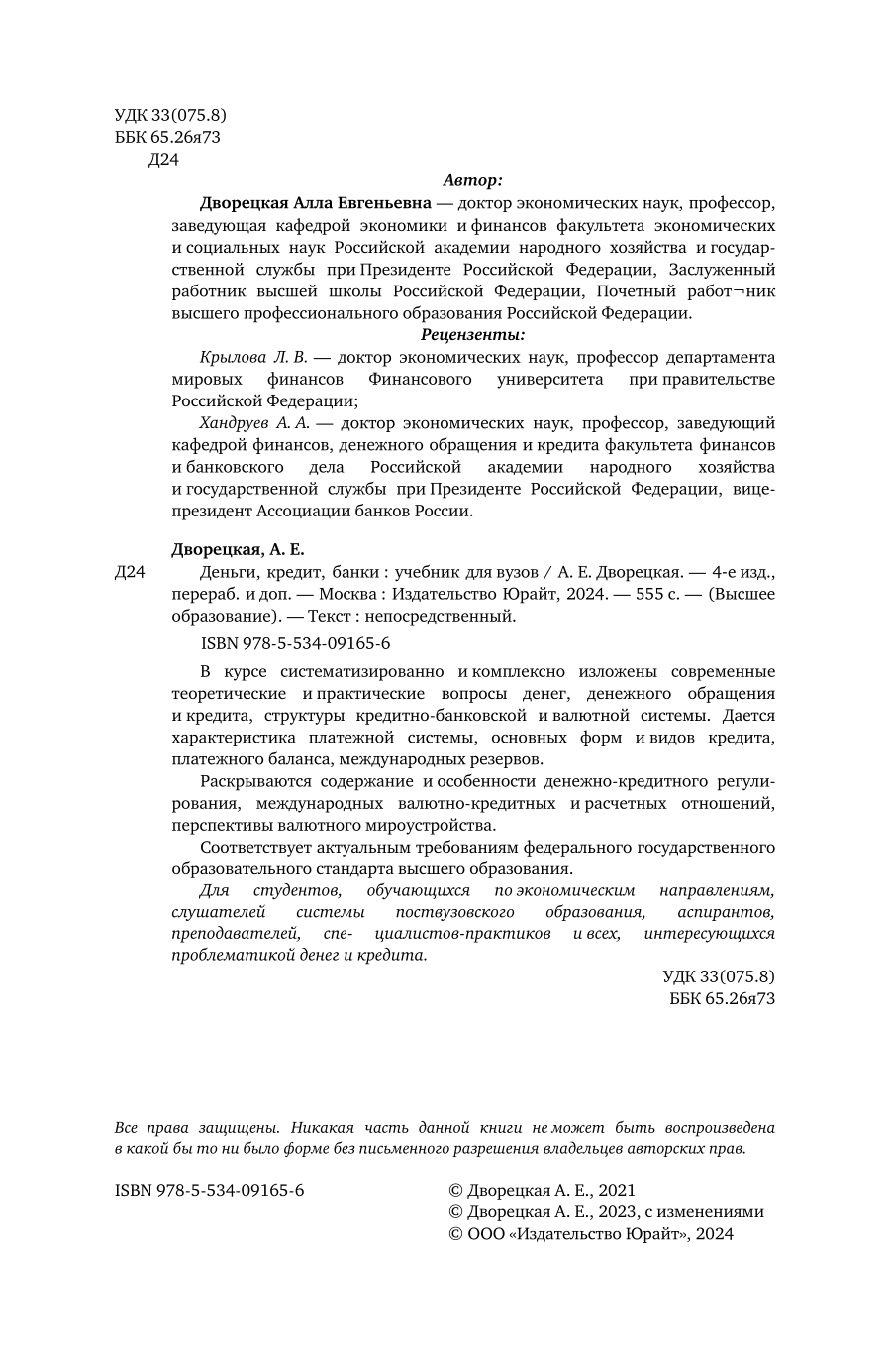Деньги кредит банки 4-е изд. пер. и доп. Учебник для вузов (Алла Евгеньевна Дворецкая); ЮРАЙТ, 2023