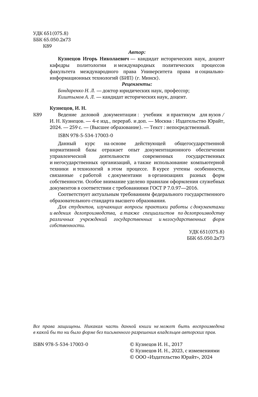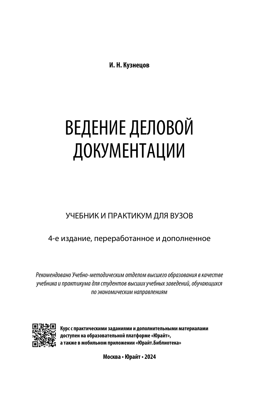 Ведение деловой документации 4-е изд. пер. и доп. Учебник и практикум для вузов (Игорь Николаевич Кузнецов); ЮРАЙТ, 2023