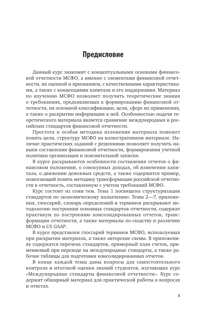 Курс знакомит студентов с основами финансовой отчетности МСФО. Материал содержит информацию о целях и структуре МСФО, требованиях, предъявляемых к формированию финансовой отчетности, их основной классификации, цели, сфере их применения, а также о принципах раскрытия информации. Теоретические данные проиллюстрированы примерами решения практических задач. Особенностью курса является сравнение международных и российских стандартов финансовой отчетности. Соответствует актуальным требованиям федерального государственного образовательного стандарта среднего профессионального образования и профессиональным требованиям. Для студентов образовательных учреждений среднего профессионального образования. Курс также будет полезен преподавателям, практикующим бухгалтерам и аудиторам.