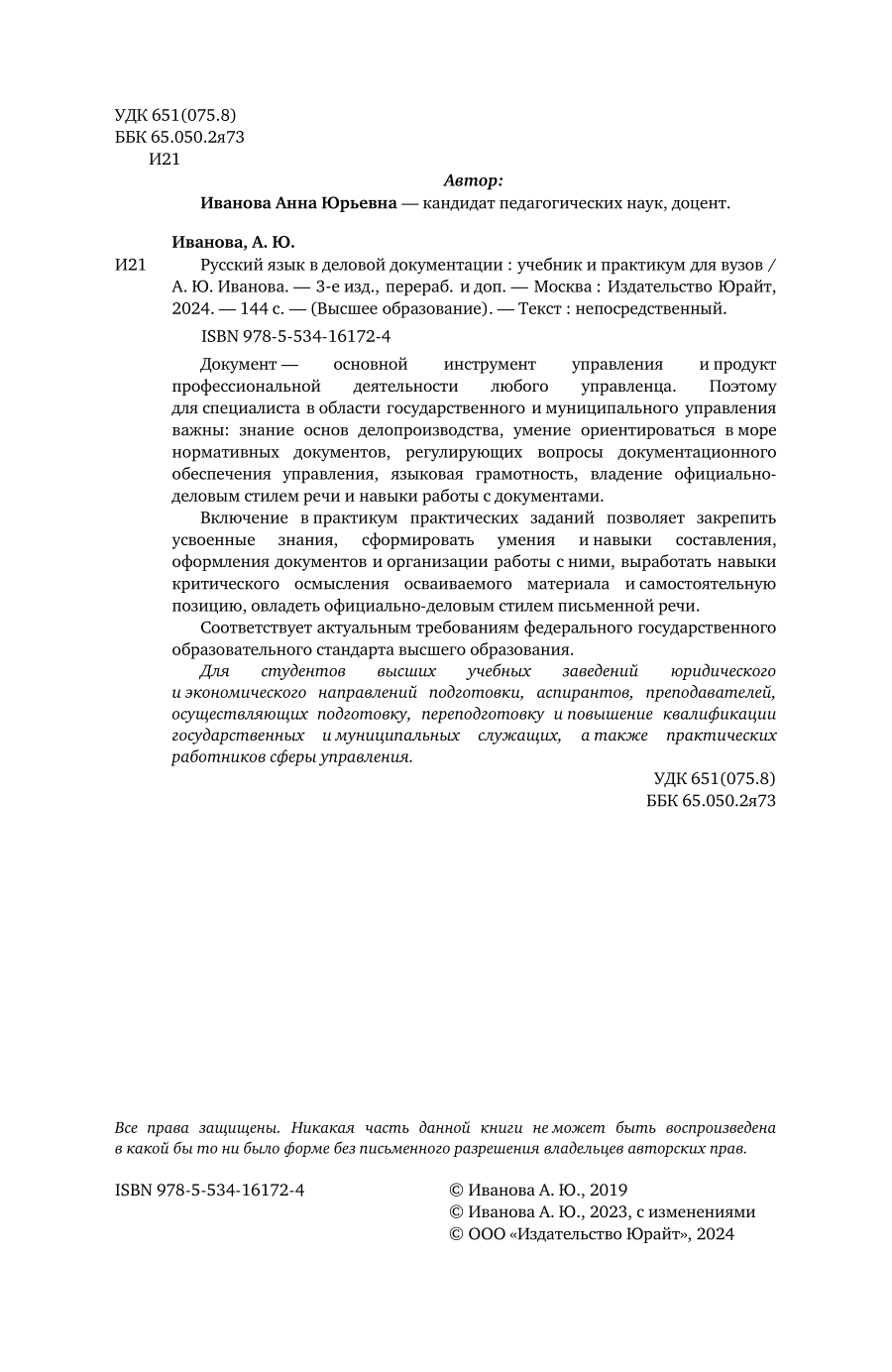 Русский язык в деловой документации 3-е изд. пер. и доп. Учебник и практикум для вузов (Анна Юрьевна Иванова); ЮРАЙТ, 2023