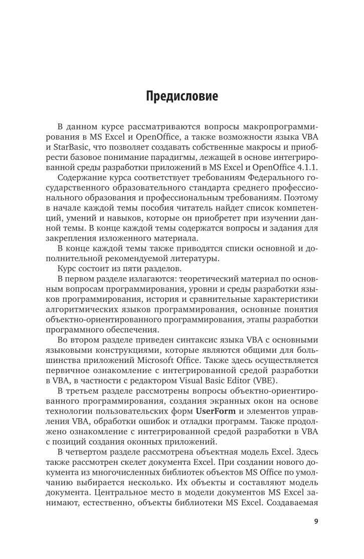 Рассматриваются вопросы макропрограммирования в OpenOffice и среде MS Excel, а также возможности языка VBA, что позволяет создавать собственные макросы и приобрести базовое понимание парадигмы, лежащей в основе интегрированной среды разработки приложений в MS Excel и Open Office 4.1.1. Данный курс рассчитан на изучение и практическое освоение основ программирования в среде VBA с целью создания приложений для решения прикладных задач в среде MS Excel. Соответствует актуальным требованиям Федерального государственного образовательного стандарта среднего профессионального образования и профессиональным требованиям. Курс ориентирован на преподавателей информатики, студентов колледжей, а также на широкий круг читателей, имеющих желание научиться программировать в табличном процессоре MS Office и OpenOffice и тем самым существенно расширить круг решаемых задач.