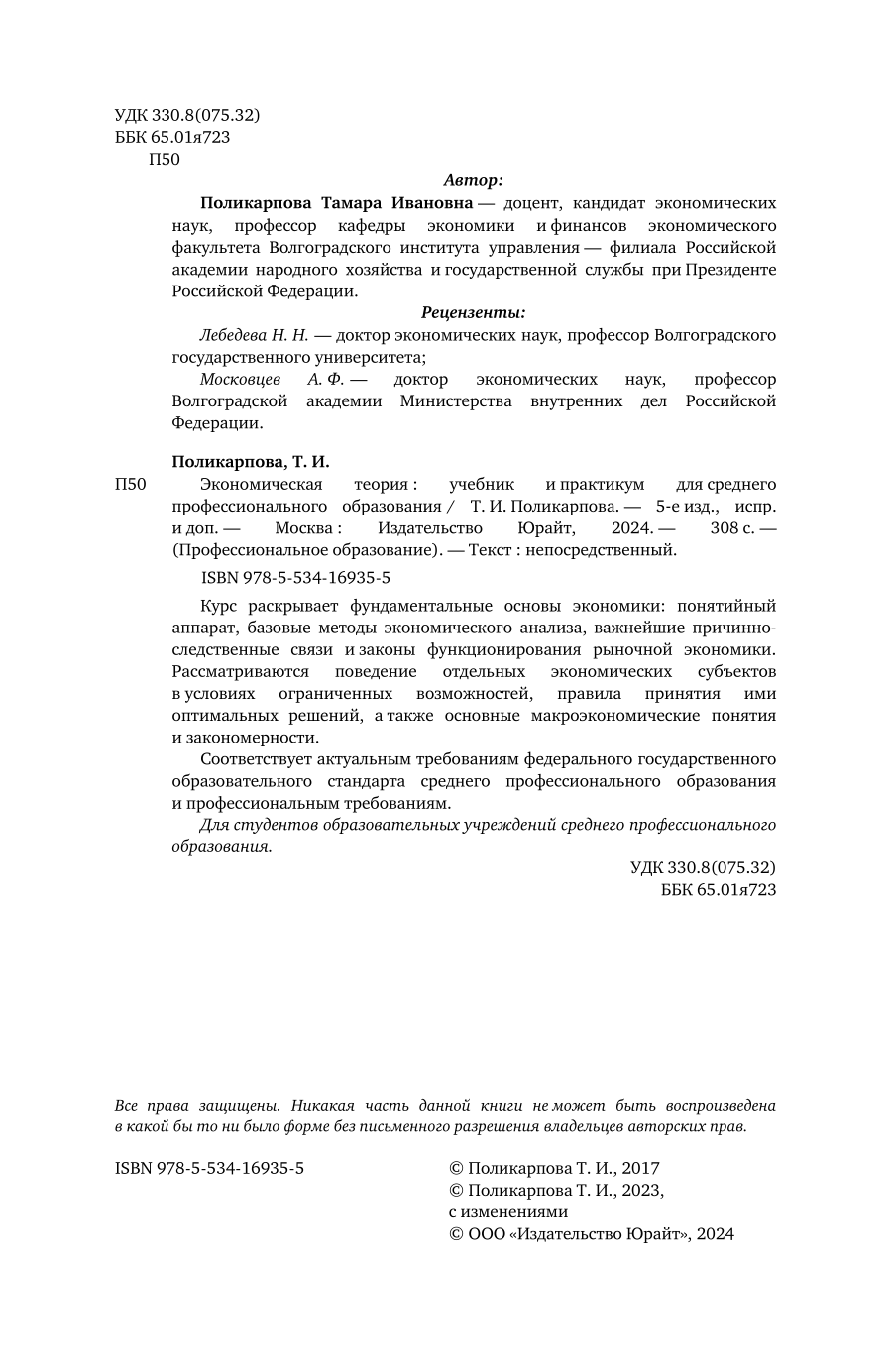 Экономическая теория 5-е изд. испр. и доп. Учебник и практикум для СПО (Тамара Ивановна Поликарпова); ЮРАЙТ, 2023
