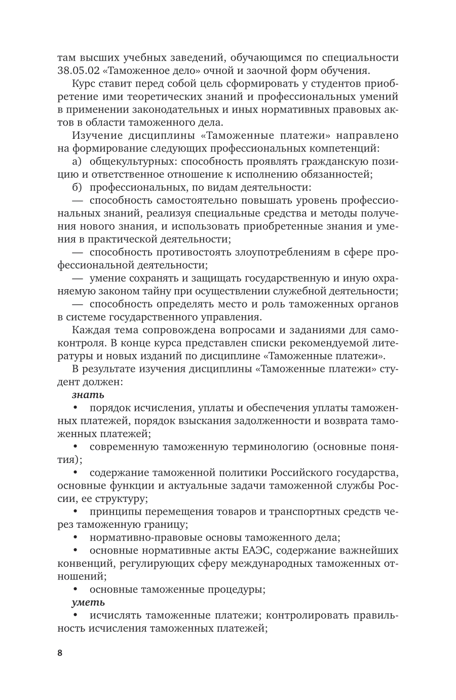 В курсе излагаются основные понятия и роль таможенных платежей, теоретические основы правового регулирования таможенных платежей, механизм правового регулирования уплаты и взимания таможенных платежей, правовой статус основных участников таможенных отношений. Исходя из таможенного законодательства рассматриваются вопросы проведения таможенных операций при уплате таможенных платежей, проведения таможенного контроля, определения таможенной стоимости. Соответствует актуальным требованиям федерального государственного образовательного стандарта высшего образования. Данный курс предназначается для студентов вузов, обучающихся по специальности «Таможенное дело», а также для аспирантов, преподавателей, специалистов по таможенному оформлению, таможенных представителей, предпринимателей и менеджеров.