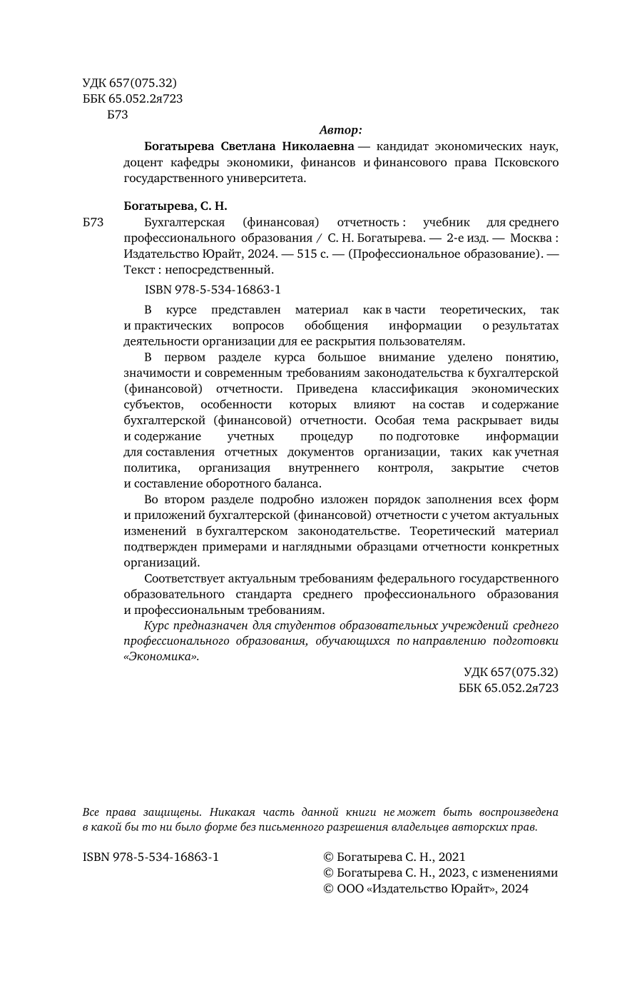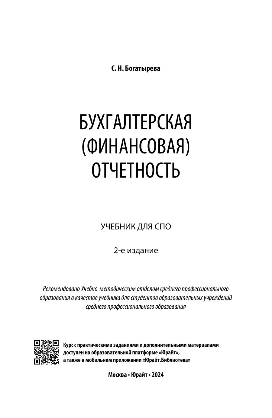 Бухгалтерская (финансовая) отчетность 2-е изд. Учебник для СПО (Светлана Николаевна Богатырева); ЮРАЙТ, 2023