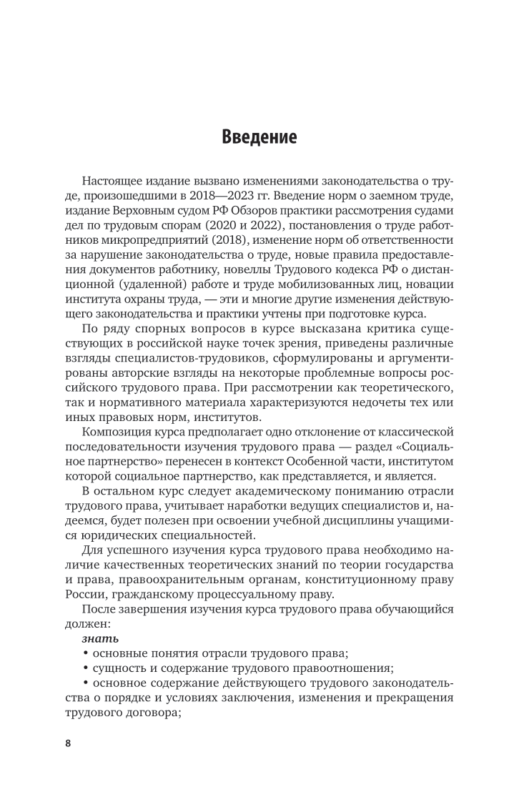 Материалы курса содержат характеристику основных институтов трудового права России с учетом актуальных изменений, а также некоторых проблемных аспектов отрасли. Курс составлен в соответствии с действующим законодательством России о труде. Соответствует актуальным требованиям федерального государственного образовательного стандарта высшего образования. Курс предназначен для изучения дисциплины «Трудовое право» учащимися высших учебных заведений по направлению подготовки «Юриспруденция», уровень подготовки - бакалавриат, специалитет, форма обучения очная и заочная.