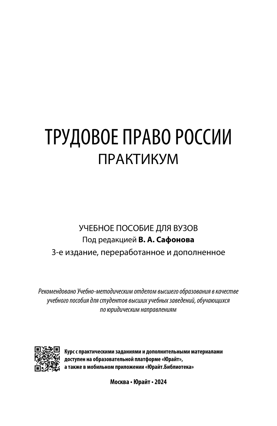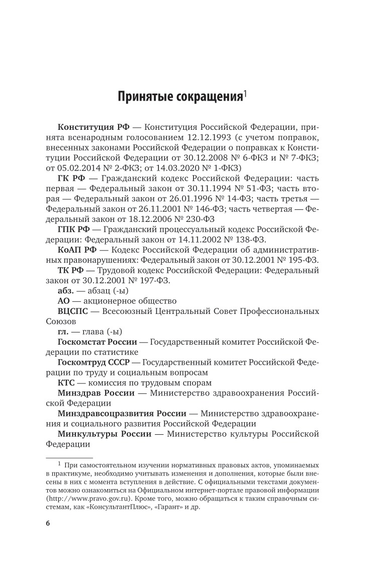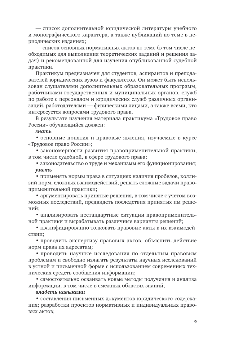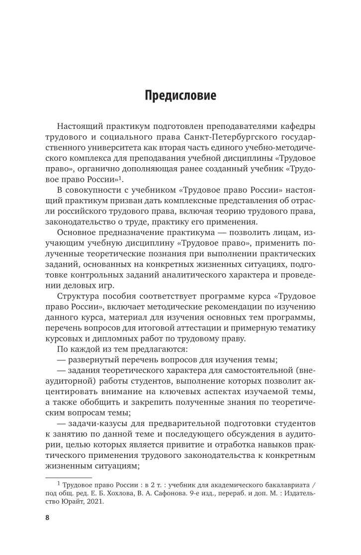 Настоящий практикум подготовлен преподавателями кафедры трудового и социального права Санкт-Петербургского государственного университета как вторая часть единого учебно-методического комплекса для преподавания учебной дисциплины «Трудовое право», органично дополняющая ранее созданный учебник «Трудовое право России». Основное предназначение практикума - позволить лицам, изучающим учебную дисциплину «Трудовое право», применить полученные теоретические познания при выполнении практических заданий, основанных на конкретных жизненных ситуациях, подготовке контрольных заданий аналитического характера и проведении деловых игр. В практикуме использовано законодательство по состоянию на 1 марта 2021 г., а также практика Конституционного Суда Российской Федерации, Верховного Суда Российской Федерации, судов общей юрисдикции по трудовым делам, органов, осуществляющих контроль (надзор) за соблюдением законодательства о труде. Соответствует актуальным требованиям федерального государственного образовательного стандарта высшего образования. Для обучающихся по образовательным программам академического бакалавриата, аспирантов и преподавателей юридических вузов и факультетов. Может быть использован слушателями дополнительных образовательных программ, работниками государственных и муниципальных органов, служб по работе с персоналом и юридических служб различных организаций, работодателями - физическими лицами, а также всеми, кто интересуется вопросами трудового права.