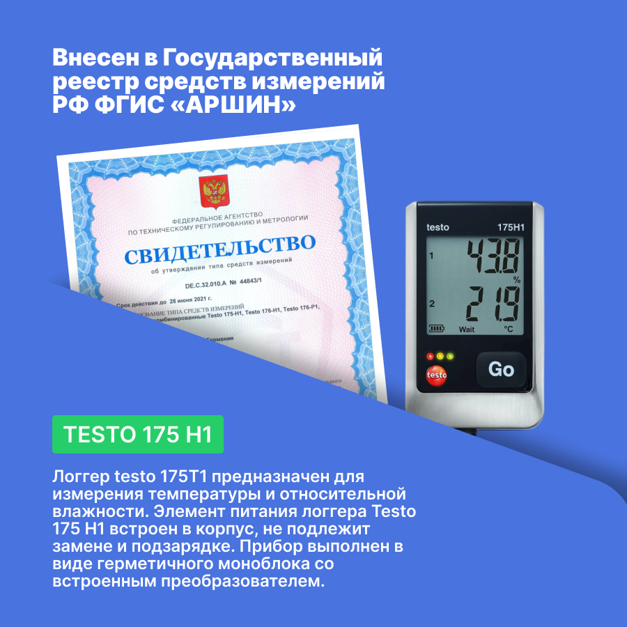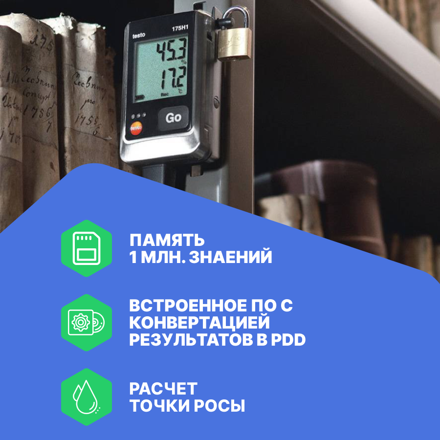Быстротекущие тепловые процессы не всегда могут быть зафиксированы с использованием недорогих измерителей, обладающих большой инерционностью, однако они могут негативно повлиять на качество изготовления высокоточной оптики, прецизионных приборов и пр. В отличие от других логгеров, у Testo 175 H1 измерительный датчик вынесен за пределы корпуса прибора, благодаря чему обеспечивается повышенная точность измерений (за счет минимизации влияния тепловых помех) и наилучшее быстродействие. Данный логгер более эффективно справляется с задачами климатического мониторинга в рабочих помещениях при выполнении технологических операций на высокоточном производстве, так как позволяет отслеживать даже быстротекущие температурно-влажностные процессы.Особенности логгера Testo 175 H1Благодаря наличию двухстрочного крупного дисплея, вы можете не только фиксировать показатели температуры и влажности в памяти прибора, но и визуально следить за текущими показаниями, не используя для этого дополнительный термометр и гигрометр.Логгер Testo 175 H1 обеспечивает долговременный мониторинг климатических условий без регулярных обслуживаний и считывания сохраненных данных за счет использования памяти большого объема и продолжительного срока службы батарей питания. Непрерывность измерений обеспечивается за счет использования режима циклической записи данных (Wrap-around) – при полном заполнении памяти новые результаты измерений записываются поверх старых.Перенос данных для анализа с логгера на ПК может выполняться через порт с использованием кабеля мини-USB или с помощью CD-карты – вы можете выбрать наиболее подходящий для себя способ, исходя из конкретных условий выполнения работ.
