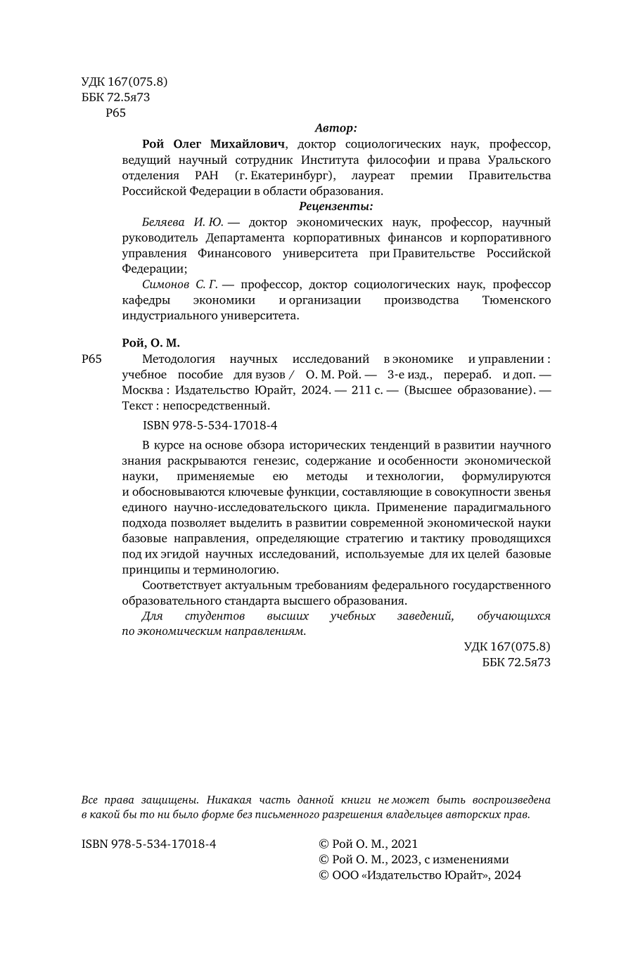 Методология научных исследований в экономике и управлении 3-е изд. пер. и доп. Учебное пособие для вузов (Олег Михайлович Рой); ЮРАЙТ, 2023