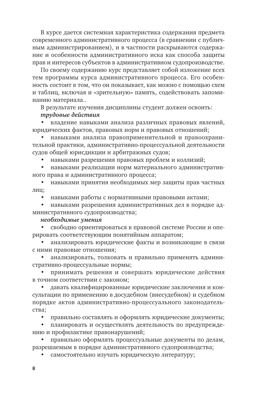 В курсе рассматриваются понятие, принципы, источники, система и основные институты административно-процессуального права как комплекса норм, регулирующих административное судопроизводство. Раскрыты вопросы разрешения дел из административных и иных публичных правоотношений судами общей юрисдикции и арбитражными судами. Наличие схематически изложенного материала дает студентам возможность существенно сократить время на подготовку и яснее видеть суть материала, проявить определенную самостоятельность в его изучении. Соответствует актуальным требованиям федерального государственного образовательного стандарта среднего профессионального образования и профессиональным требованиям. Курс предназначен для студентов юридических направлений и специальностей.