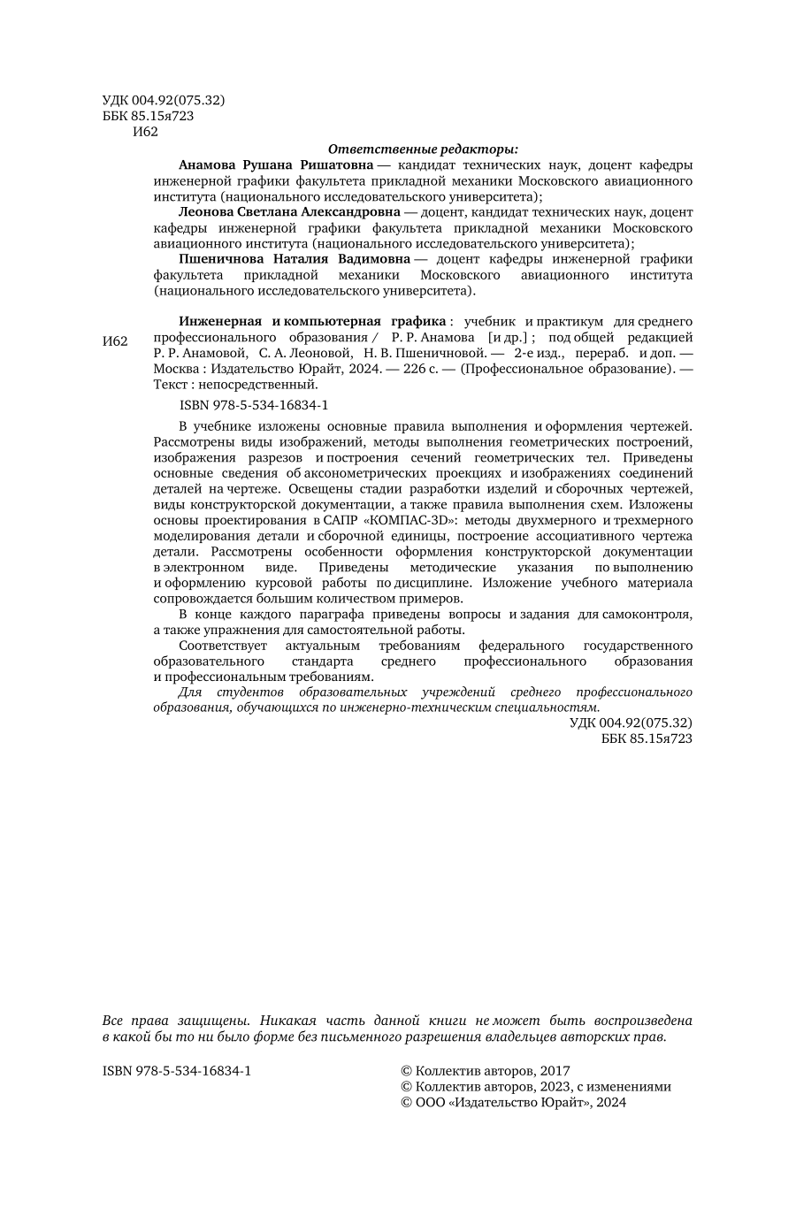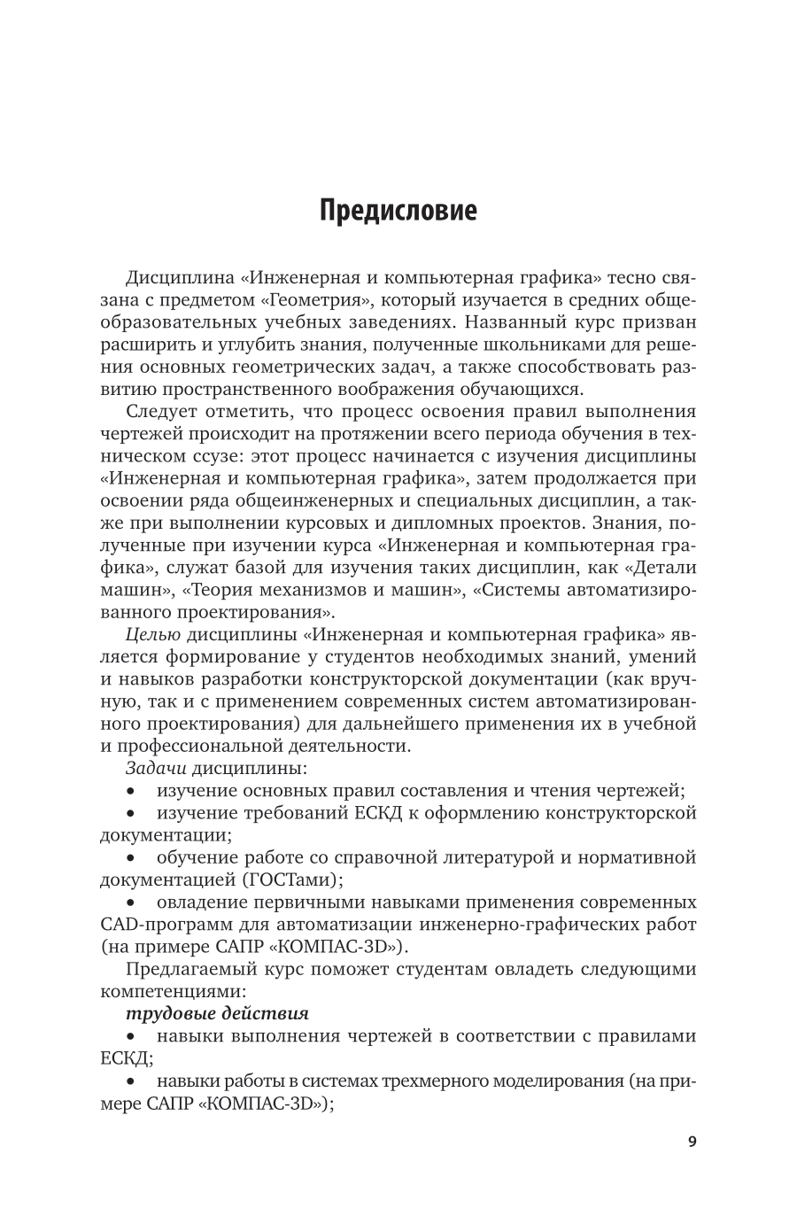 В книге рассматриваются основные принципы и правила выполнения чертежей, как традиционным способом (с помощью карандаша и линейки), так и с помощью современных систем автоматизированного проектирования (на примере САПР «КОМПАС-3D»). Изложенные теоретические положения подкреплены большим количеством примеров. Содержание учебника обеспечивает преемственность чертежно-графического образования и поможет ликвидировать у обучающихся пробелы в базовых знаниях по данному курсу. Многочисленные задания для самостоятельной работы и тестовые задания, будучи средством проверки уровня и качества освоения дисциплины, станут весомым подспорьем как для студента в процессе обучения, так и для преподавателя при рубежном и итоговом контроле знаний студентов.